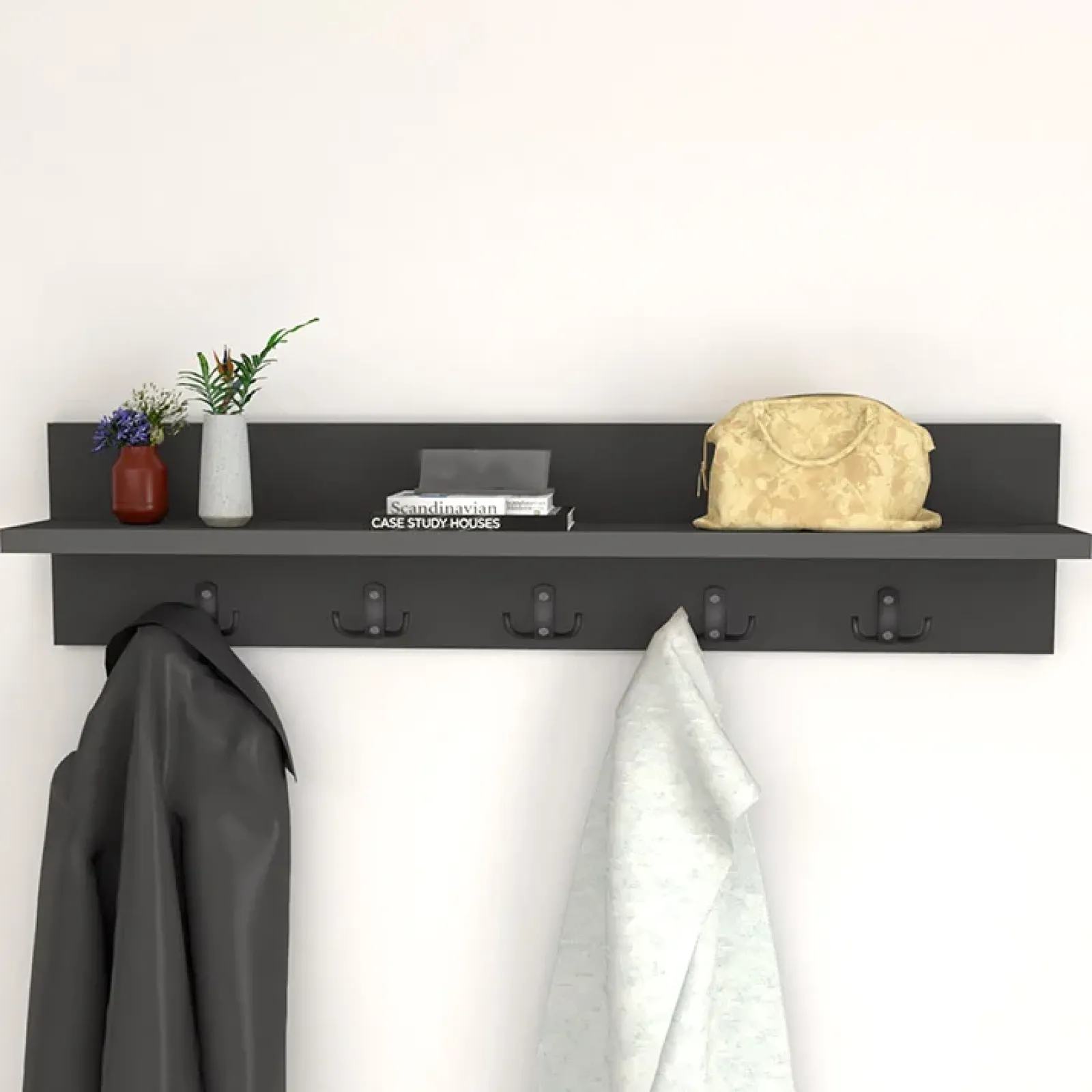 Realizzato in finitura antracite è formato da 5 ganci, per appendere giacche e ombrelli, e da una mensola superiore perfetta per depositare cappelli e borse.