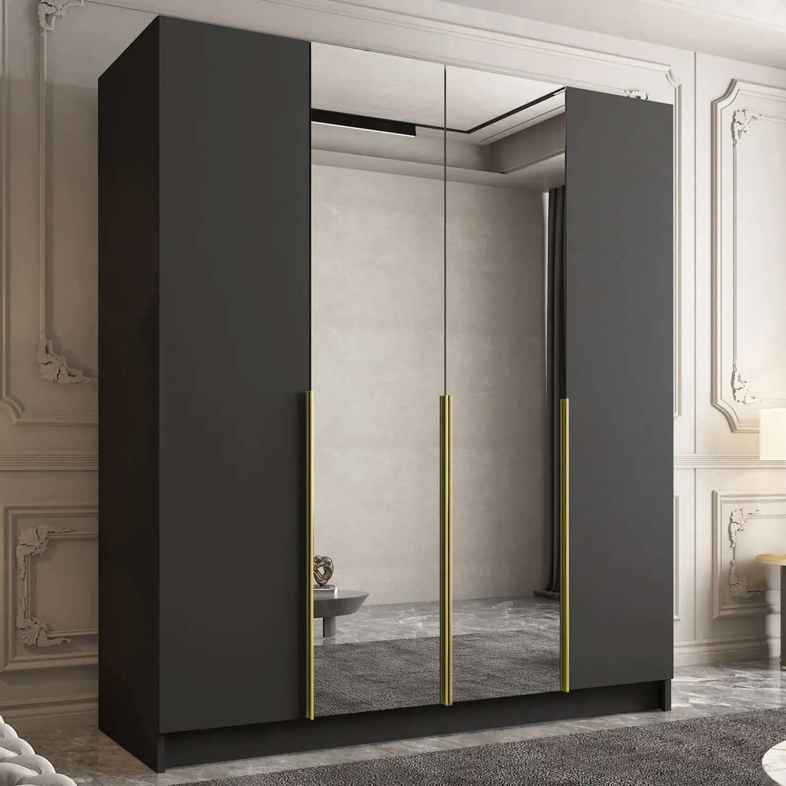 Armadio camera da letto 200x215cm 4 ante 2 specchi nero oro Glammy 4
