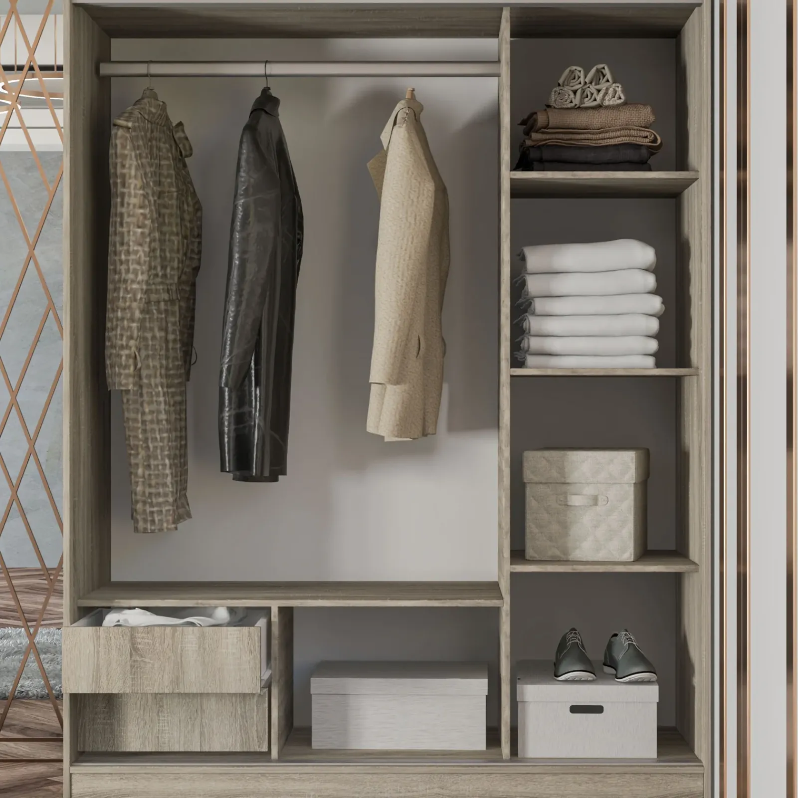 Collodi dietro le sue ante scorrevoli racchiude a destra ben 4 spaziosi vani e nella parte sinistra un vano munito di asta appendiabiti ed una comoda cassettiera.
