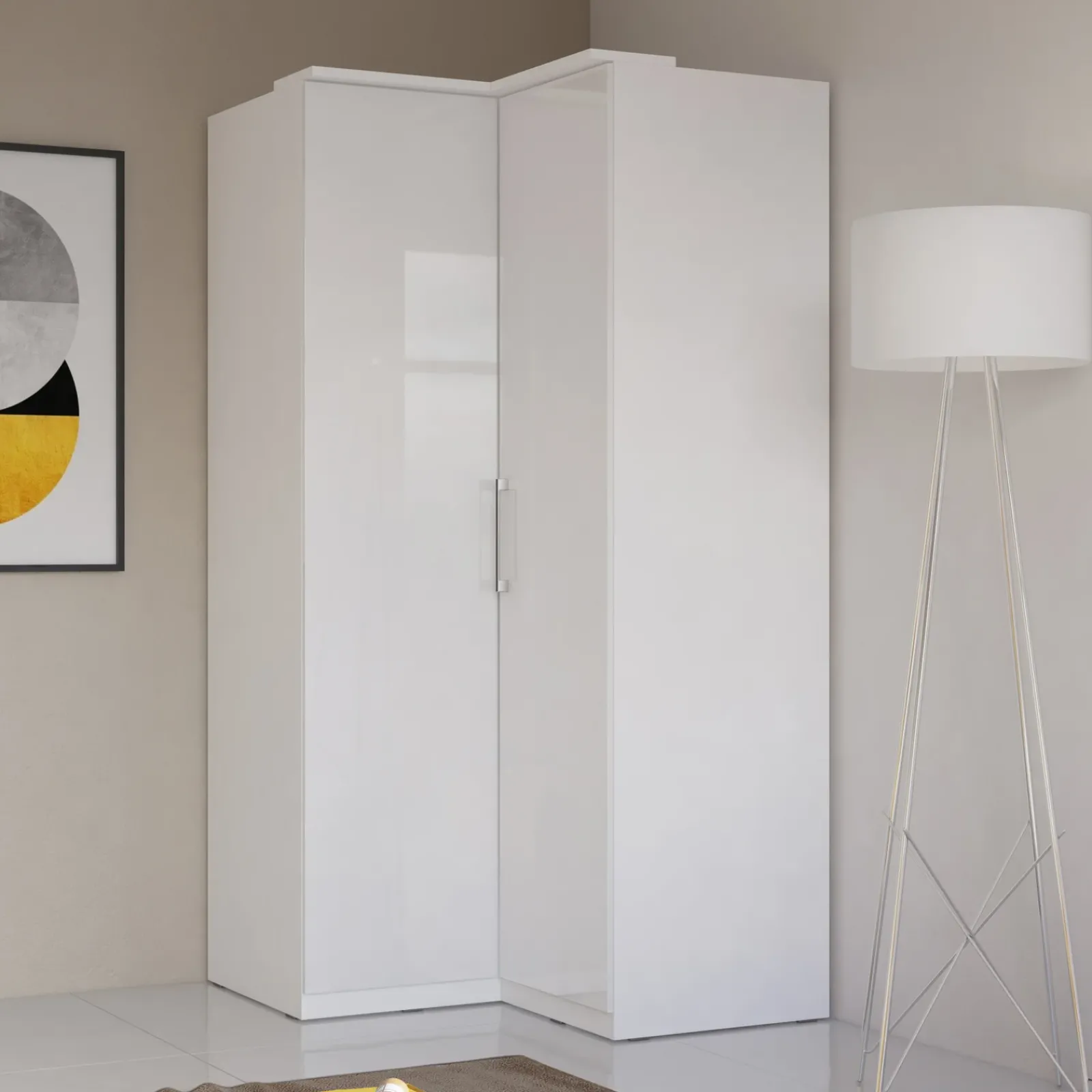 Armadio ad angolo Naper bianco opaco bianco lucido: un complemento d’arredo versatile che puoi utilizzare nella tua stanza oppure anche in ripostiglio moderno.