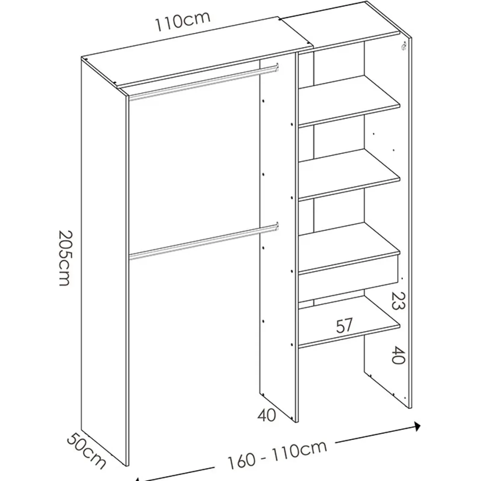 Basico e funzionale, il corpo centrale, con lunghezza 110cm, è comprensivo di due barre appendiabiti in alluminio, dove potrai appendere abiti di diversa lunghezza. Se si desidera utilizzare questa lunghezza, le due barre devono essere tagliate su misura, come anche la barra che sorregge la tenda. Sul lato 4 ripiani, che devono essere fissati al tramezzo divisorio, ed un cassetto, con interno in finitura tessile.
