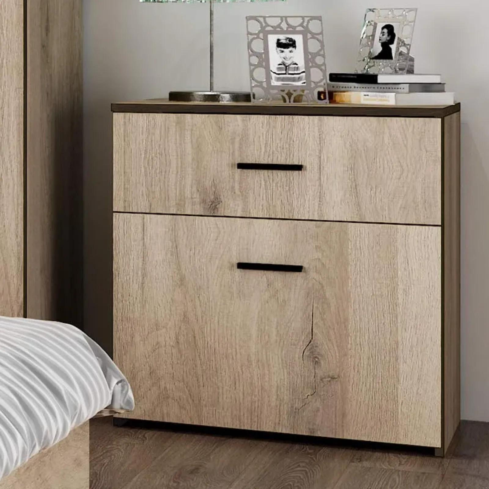 Camera da letto completa matrimoniale rovere sonoma Iglesia: i bordi con finitura in contrasto mettono in risalto e caratterizzano questa composizione dallo stile unico.