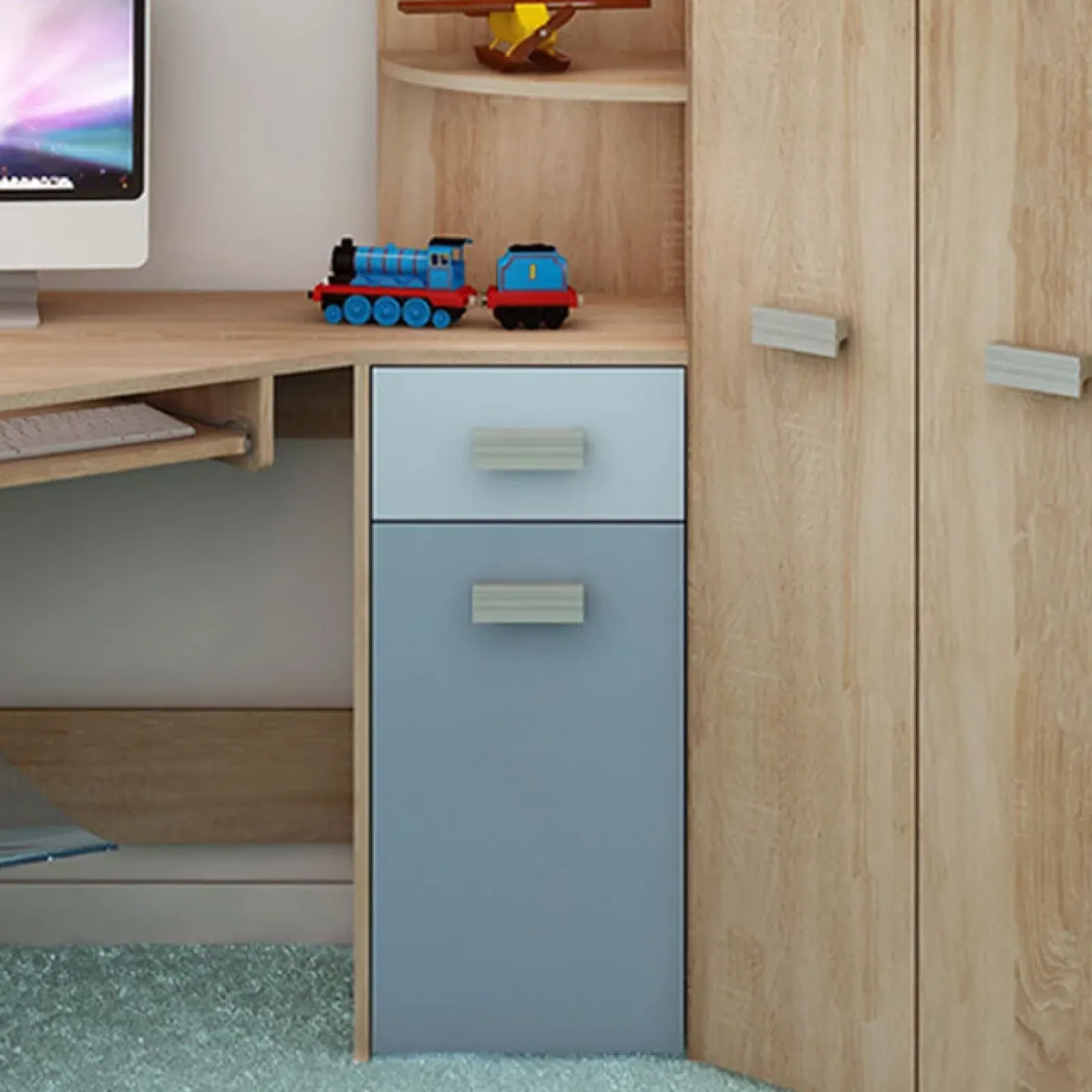 La Cameretta Dollie Gihome® destra rovere blu: la soluzione ideale per la cameretta dei tuoi ragazzi. Dotata di armadio, cassetti e mensole rende funzionale ogni spazio per il riodino di indumenti e giocattoli.
