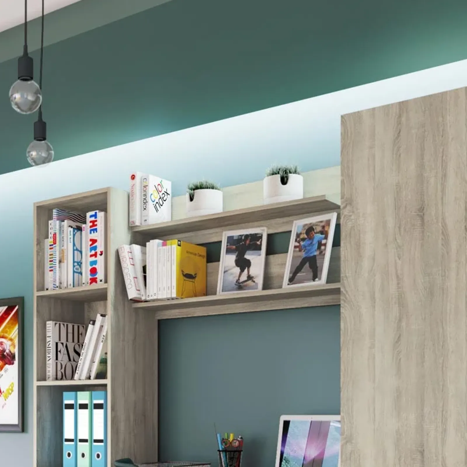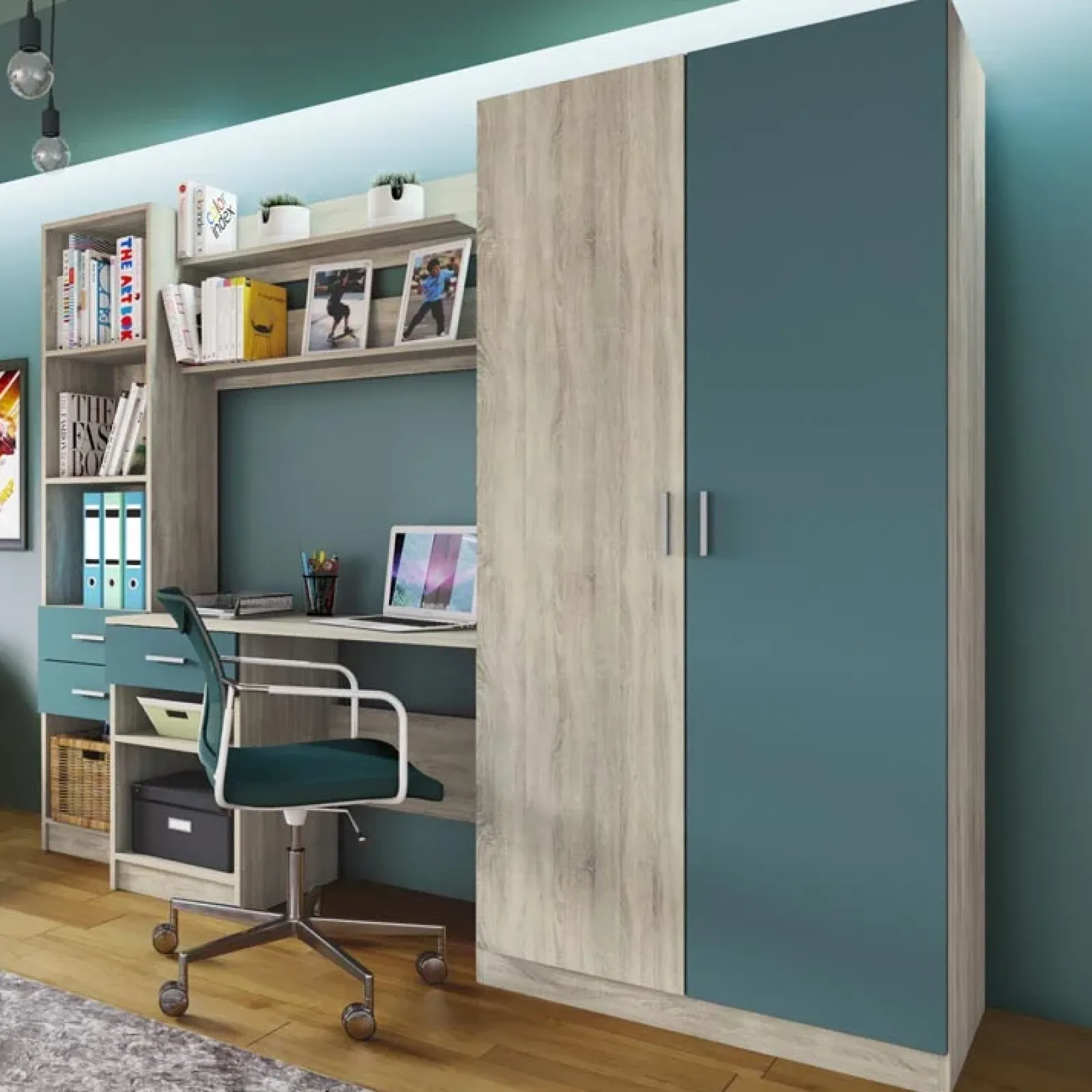 Infine, il giusto mix di colore rovere e blu petrolio conferisce un’aria vivace e allegra a questa cameretta, perfetta per studiare, giocare e crescere in tutta armonia.