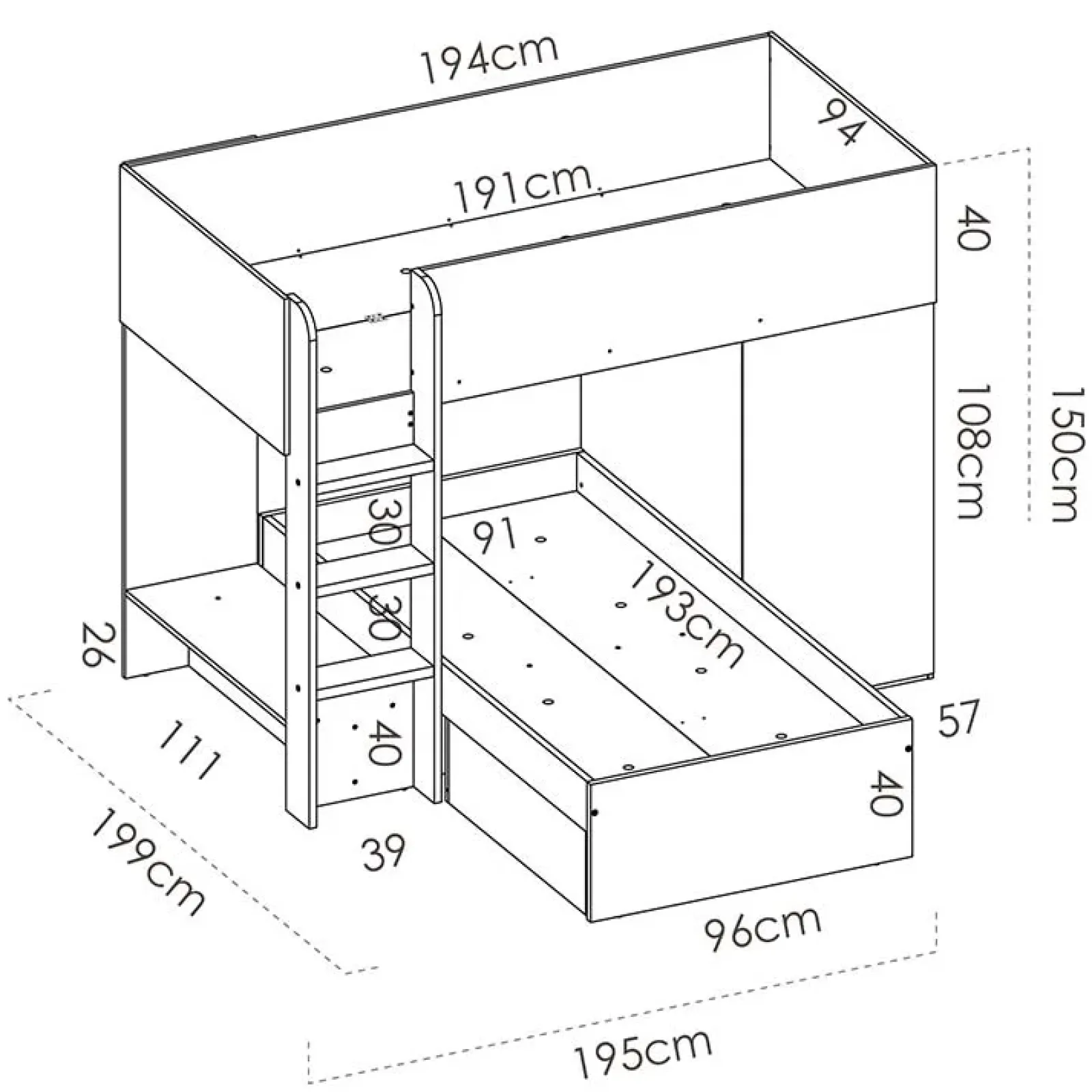 - letto inferiore dotato di 2 cassetti estraibili