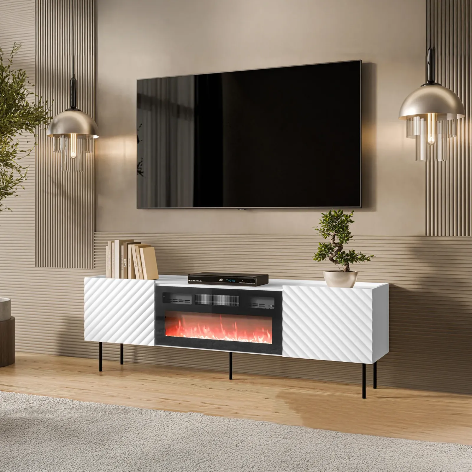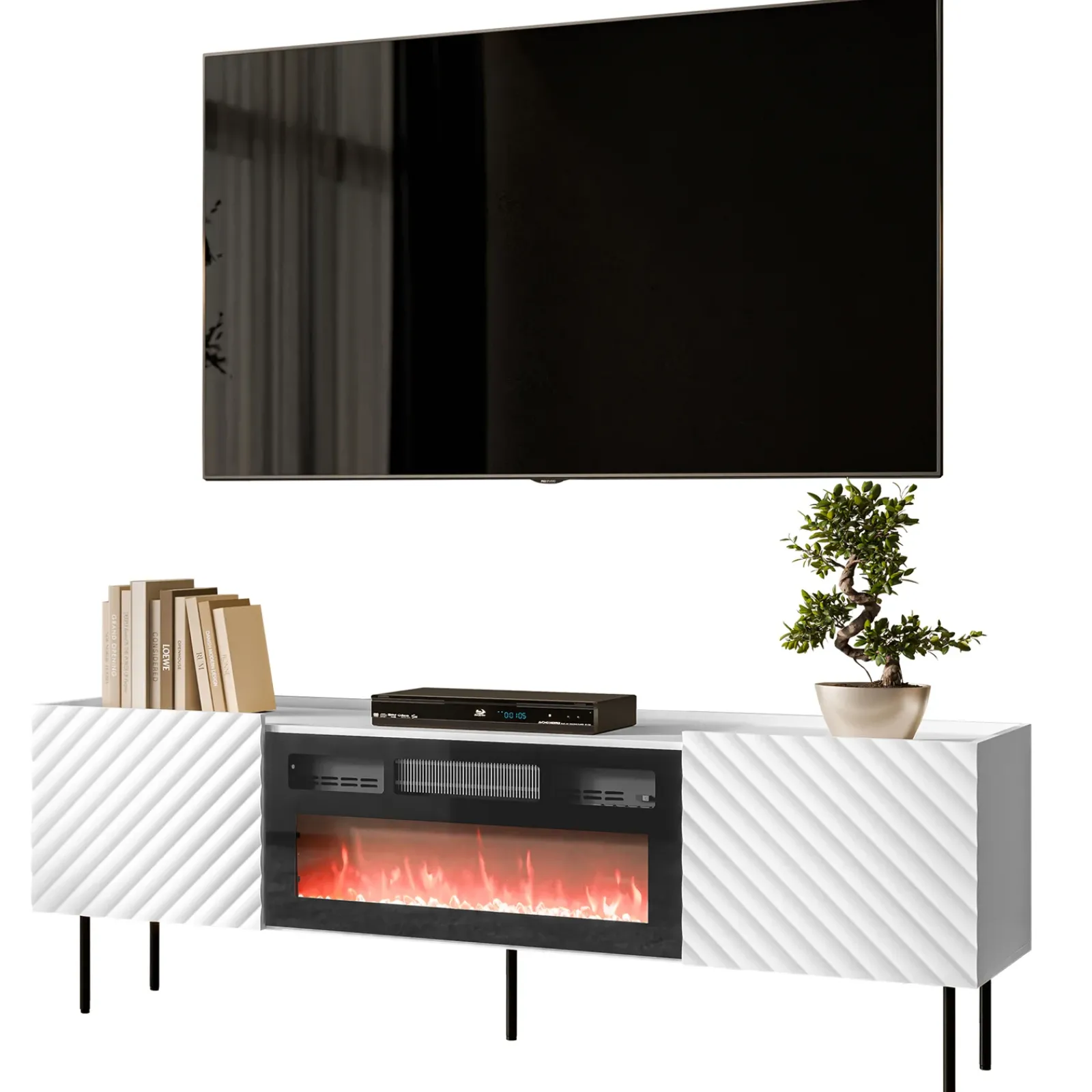 Garnero Arredamenti Camino Elettrico|Mobile Tv Basso-Mobile porta TV 181x59h cm 2 ante con caminetto con frontali decorati bianco Daniele Bianco Opaco
