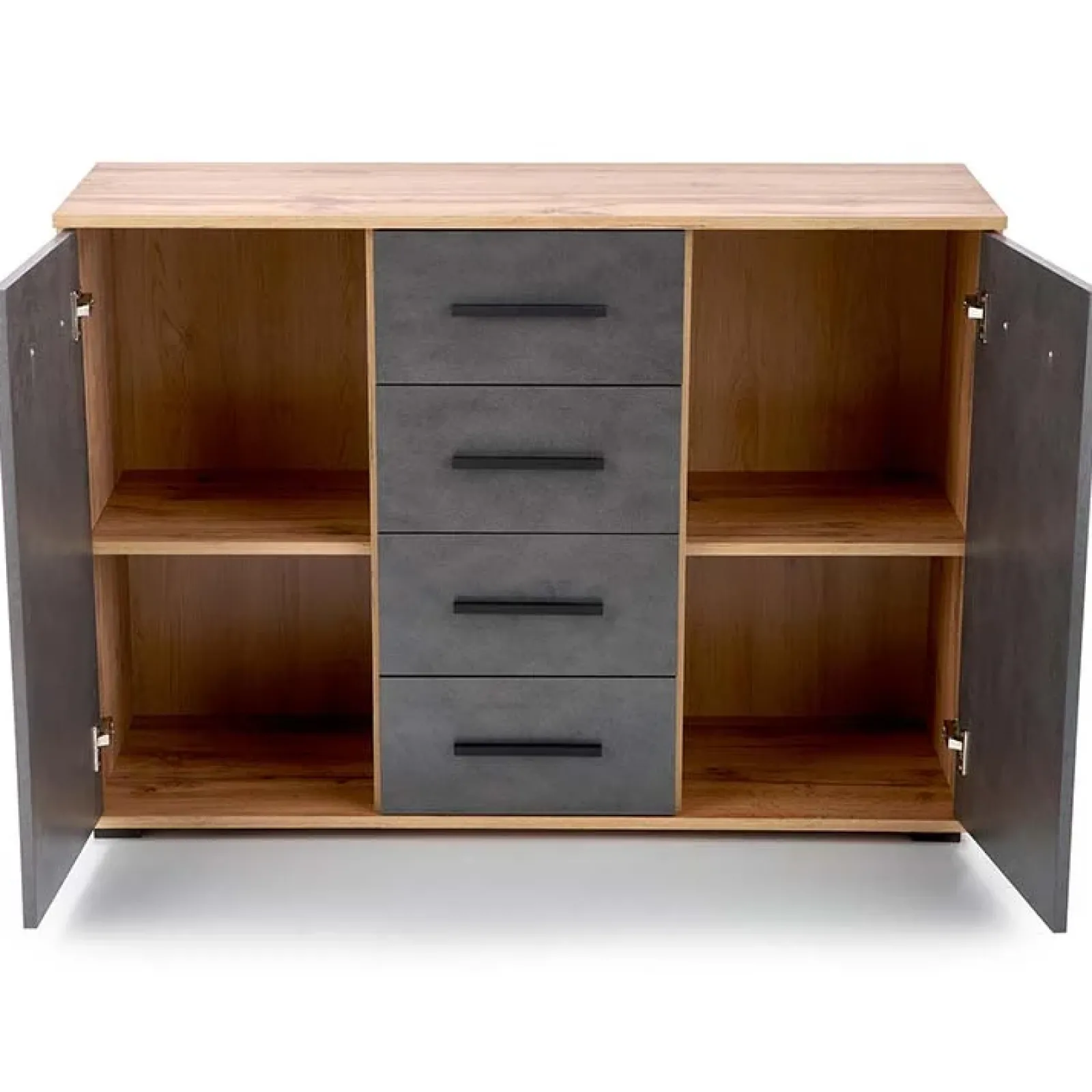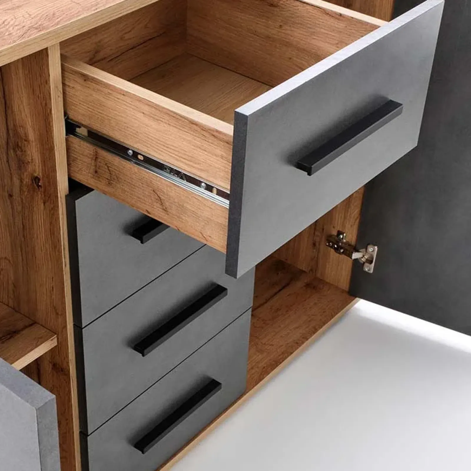 Cassettiera 4 cassetti 2 ante Viki rovere grigio: design originale, nuovo ed elegante. Perfetto per adattarsi ad ogni stile e ad ogni stanza della tua casa.