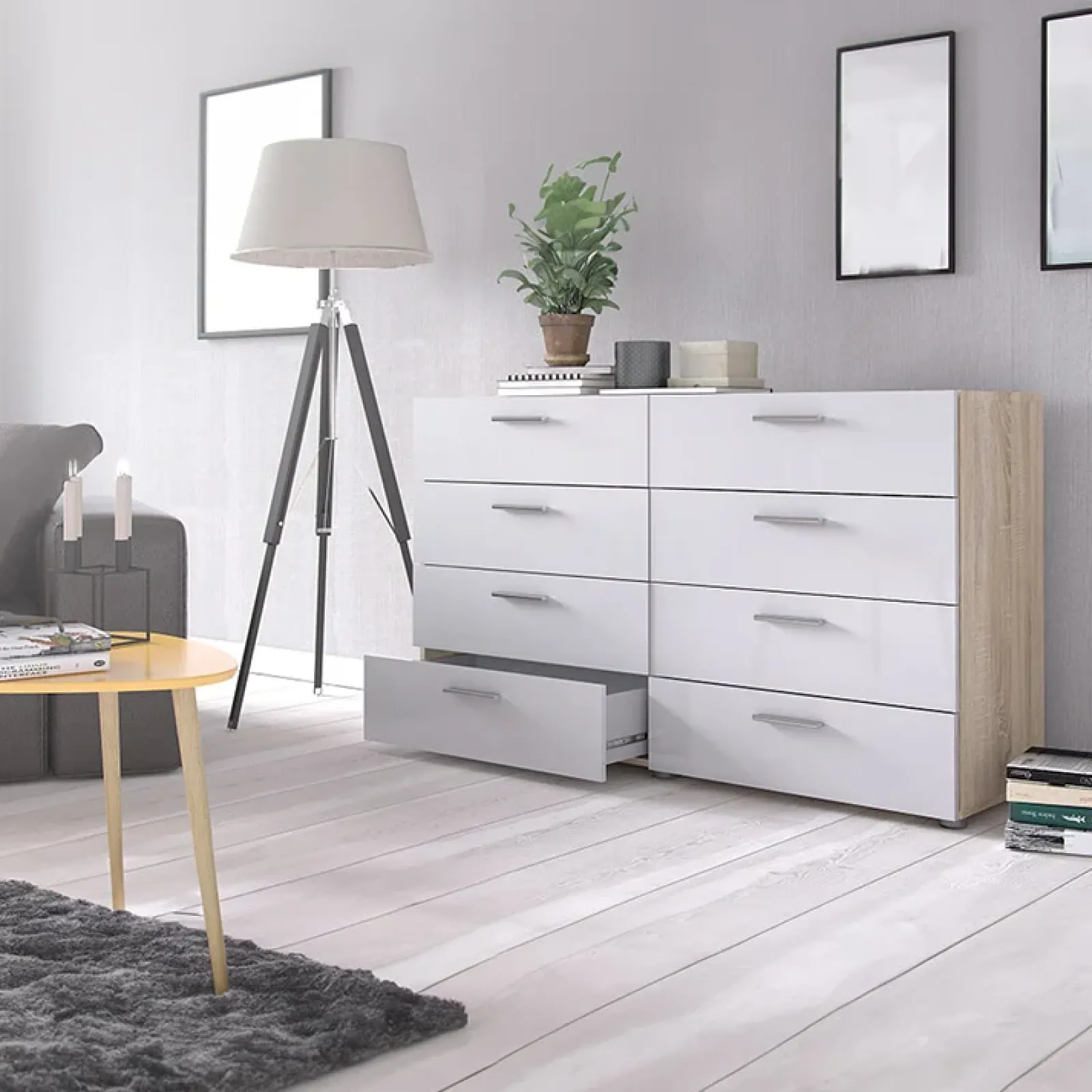 Cassettiera credenza moderna Betty Gihome ® disponibile in bianco/rovere. Dalla forma razionale e contemporanea con maniglie lineari grigie.