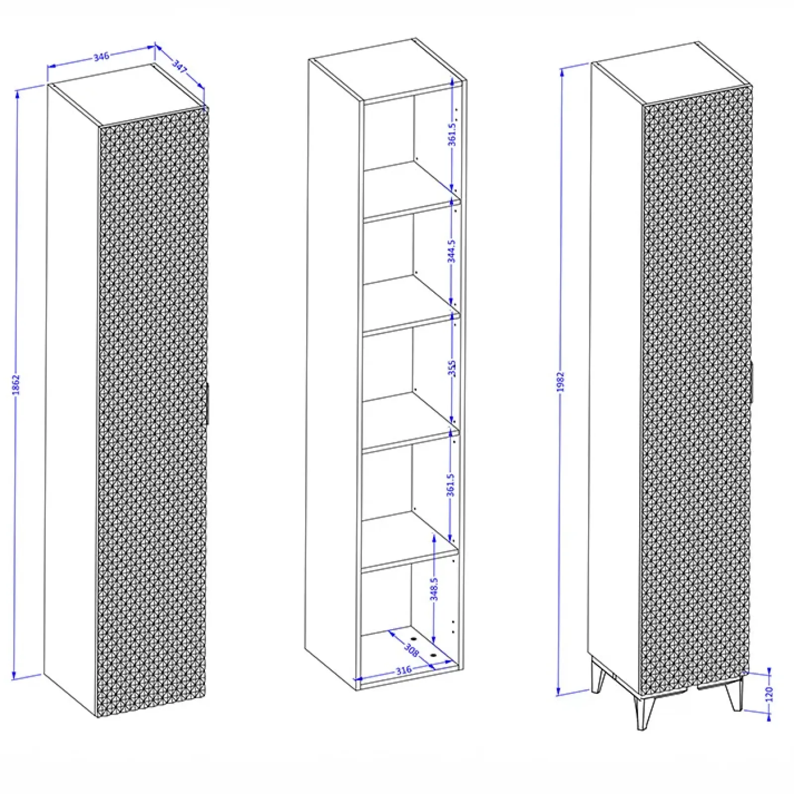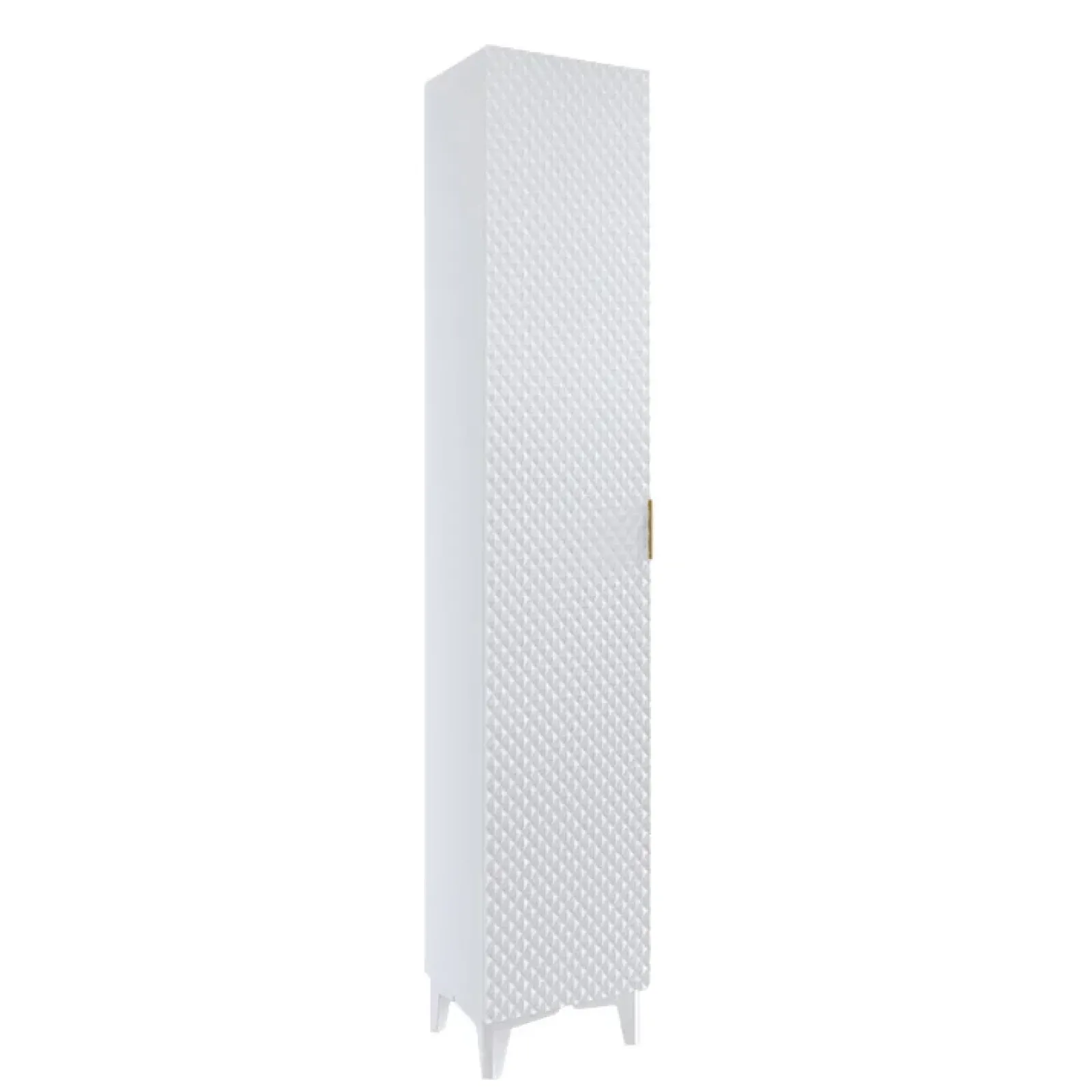 Sfrutta ogni centimetro del tuo bagno con la colonna a terra Konny! Ottimizza lo spazio e arreda con eleganza. All’interno è composta da 5 vani e 4 ripiani per poter posizionare comodamente i prodotti che più si preferisce in maniera ordinata. L’anta che chiude i vani è reversibile, per permettere in fase di montaggio di scegliere se posizionarla a destra o a sinistra. L’anta è decorata con piramidi in rilievo in finitura bianco opaco per donare alla colonna uno stile geometrico contemporaneo. Inoltre la maniglia in metallo dorata permette una comodità di apertura e chiusura dell’anta. La finitura bianco lucido conferisce al mobile uno stile elegante ma semplice. Dotata di due comodi piedini per avere la massima stabilità, offre praticità e un tocco di stile al tuo bagno!