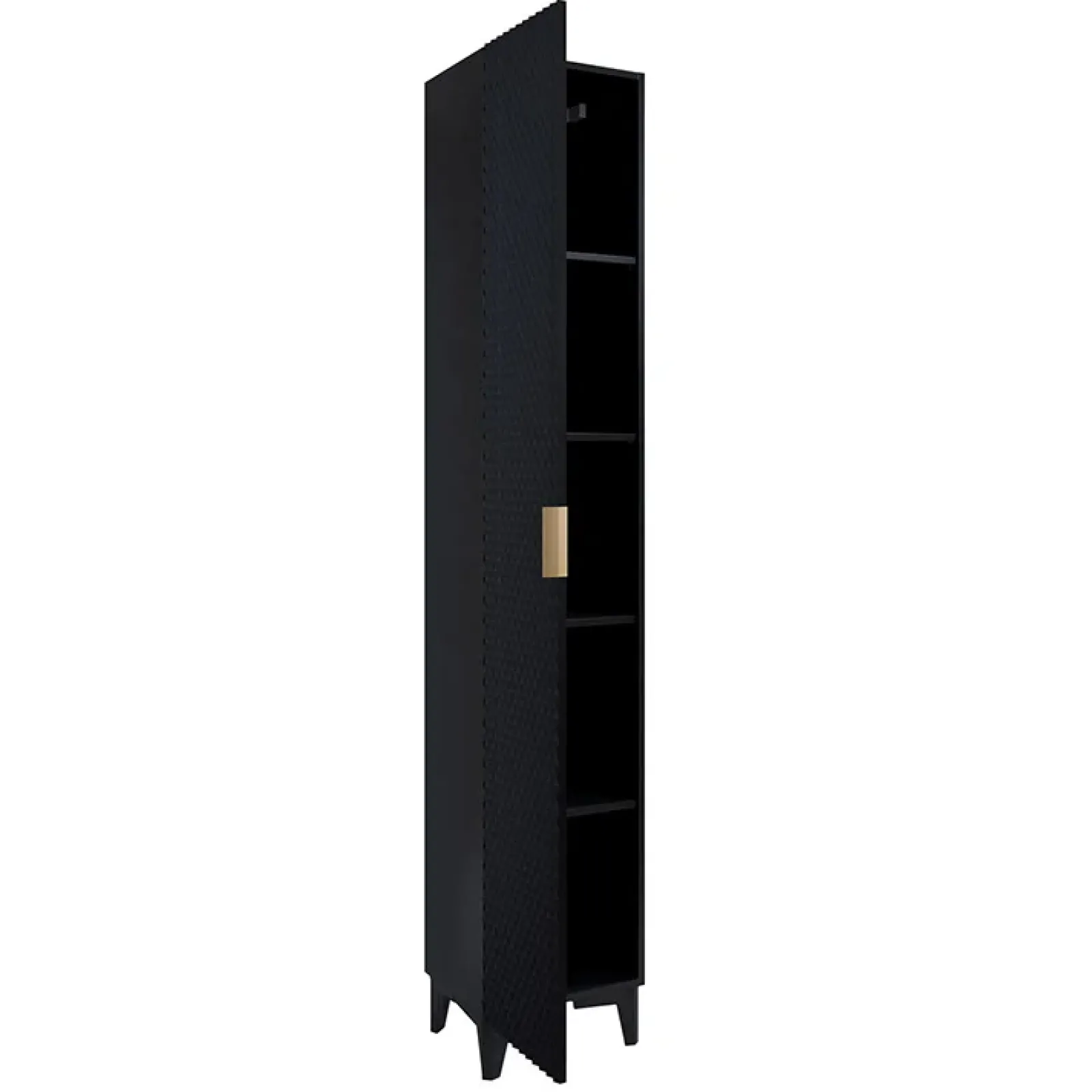 Sfrutta ogni centimetro del tuo bagno con la colonna a terra Konny! Ottimizza lo spazio e arreda con eleganza. All’interno è composta da 5 vani e 4 ripiani per poter posizionare comodamente i prodotti che più si preferisce in maniera ordinata. L’anta che chiude i vani è reversibile, per permettere in fase di montaggio di scegliere se posizionarla a destra o a sinistra. L’anta è decorata con piramidi in rilievo in finitura nero opaco per donare alla colonna uno stile geometrico contemporaneo. Inoltre la maniglia in metallo dorata permette una comodità di apertura e chiusura dell’anta. La finitura nero onice conferisce al mobile uno stile elegante ma semplice. Dotata di due comodi piedini per avere la massima stabilità, offre praticità e un tocco di stile al tuo bagno!
