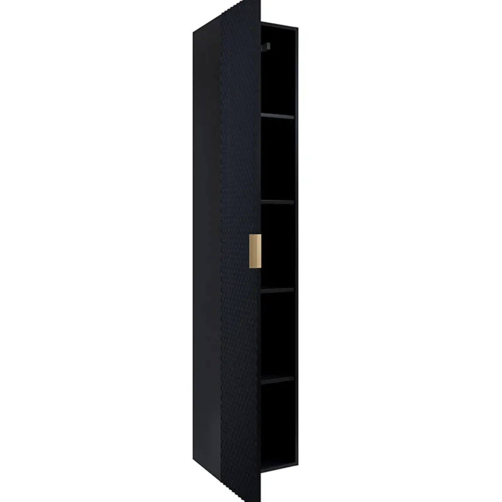 Sfrutta ogni centimetro del tuo bagno con la colonna sospesa Konny! Ottimizza lo spazio e arreda con eleganza. All’interno presenta 5 vani e 4 ripiani per poter posizionare comodamente i prodotti che più preferisci in maniera ordinata.L’anta che chiude i vani è reversibile, per permettere in fase di montaggio di scegliere se posizionarla a destra o a sinistra. L’anta è decorata con piramidi in rilievo in finitura nero opaco per donare alla colonna uno stile geometrico contemporaneo. Inoltre la maniglia in metallo dorata permette una comodità di apertura e chiusura dell’anta. La finitura nero onice conferisce al mobile uno stile elegante ma semplice. È una soluzione pratica senza ingombri:libera il pavimento e aumenta lo spazio!