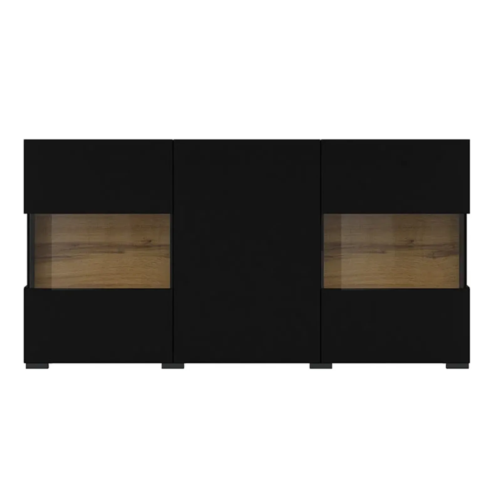 La madia moderna Fusion è dotata di: bordi ricoperti da una fascia perimetrale su tutti i lati e due ante battenti laterali, con la parte centrale di vetro trasparente, che rende visibile uno dei tre vani interni. Qui è possibile esporre i propri elementi da collezione.