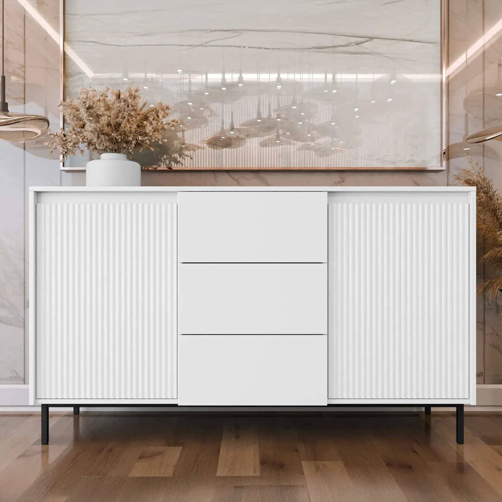 Garnero Arredamenti Credenze Moderne|Madie Moderne-Madia 153x90h cm 3 cassetti design cannettato bianco Strike Bianco Opaco