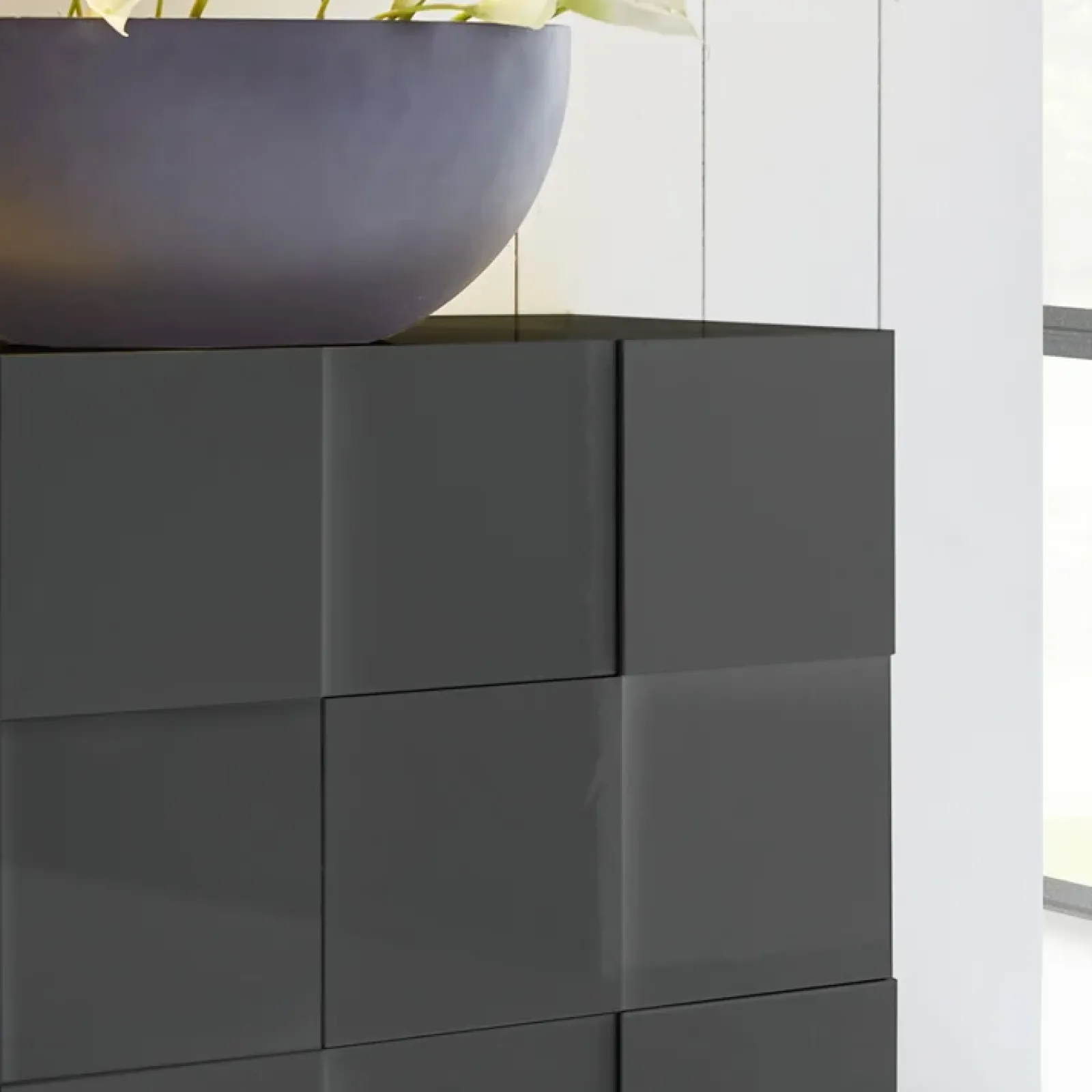 Madia moderna soggiorno 3 ante 181x84cm grigio lucido Obsession, a 3 ante battenti con originale lavorazione. Disponibile in finiture grigio lucido. Una linea di madie moderne innovative ed eleganti.