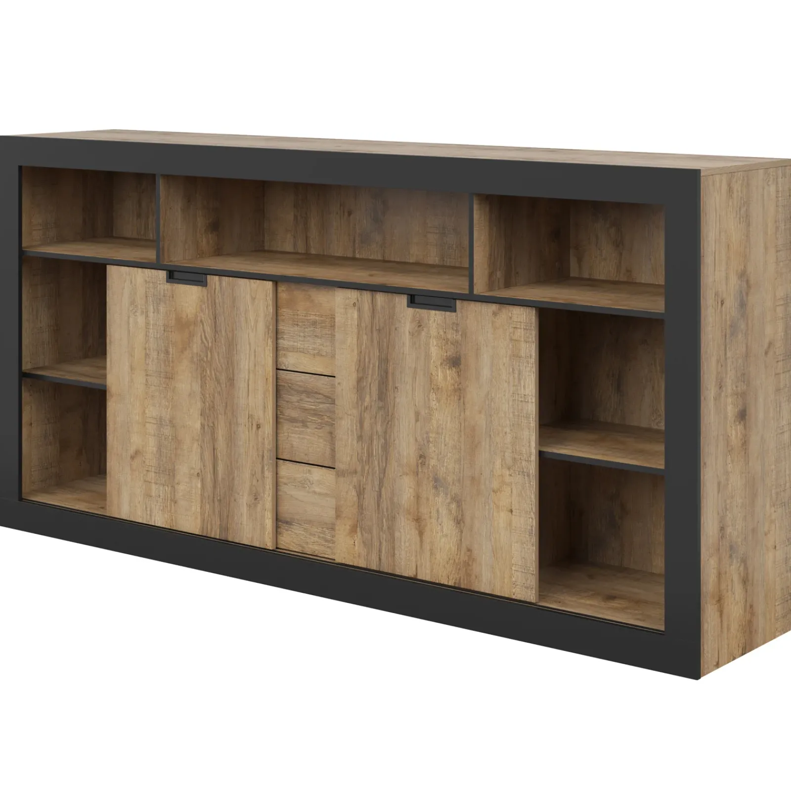 Garnero Arredamenti Credenze Moderne|Madie Moderne-Madia 220×110 h cm 2 ante 3 cassetti 6 vani a giorno rovere rustico nero Ilyssa