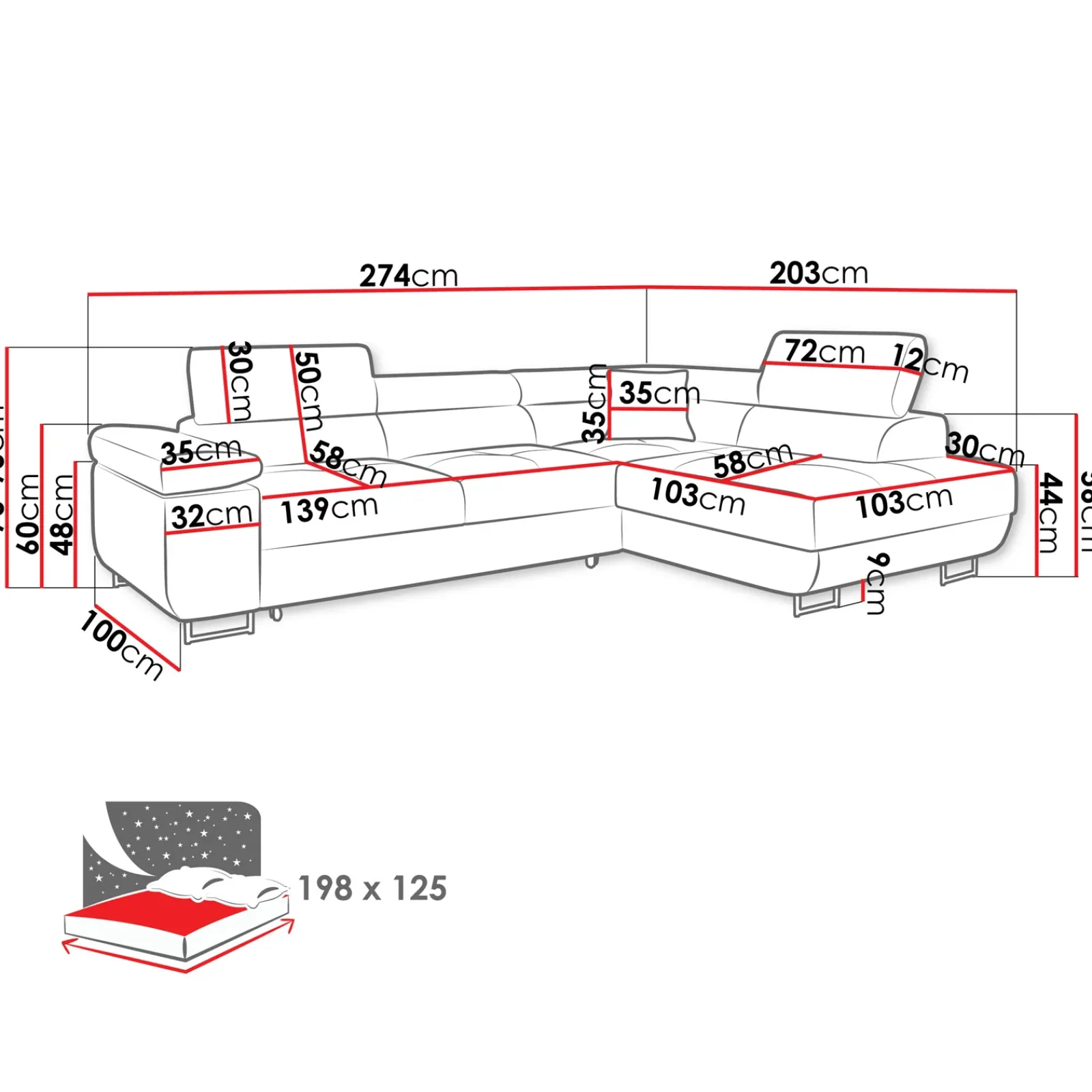 | Dimensioni | L.274 x H.70/90 x P.203 cm |