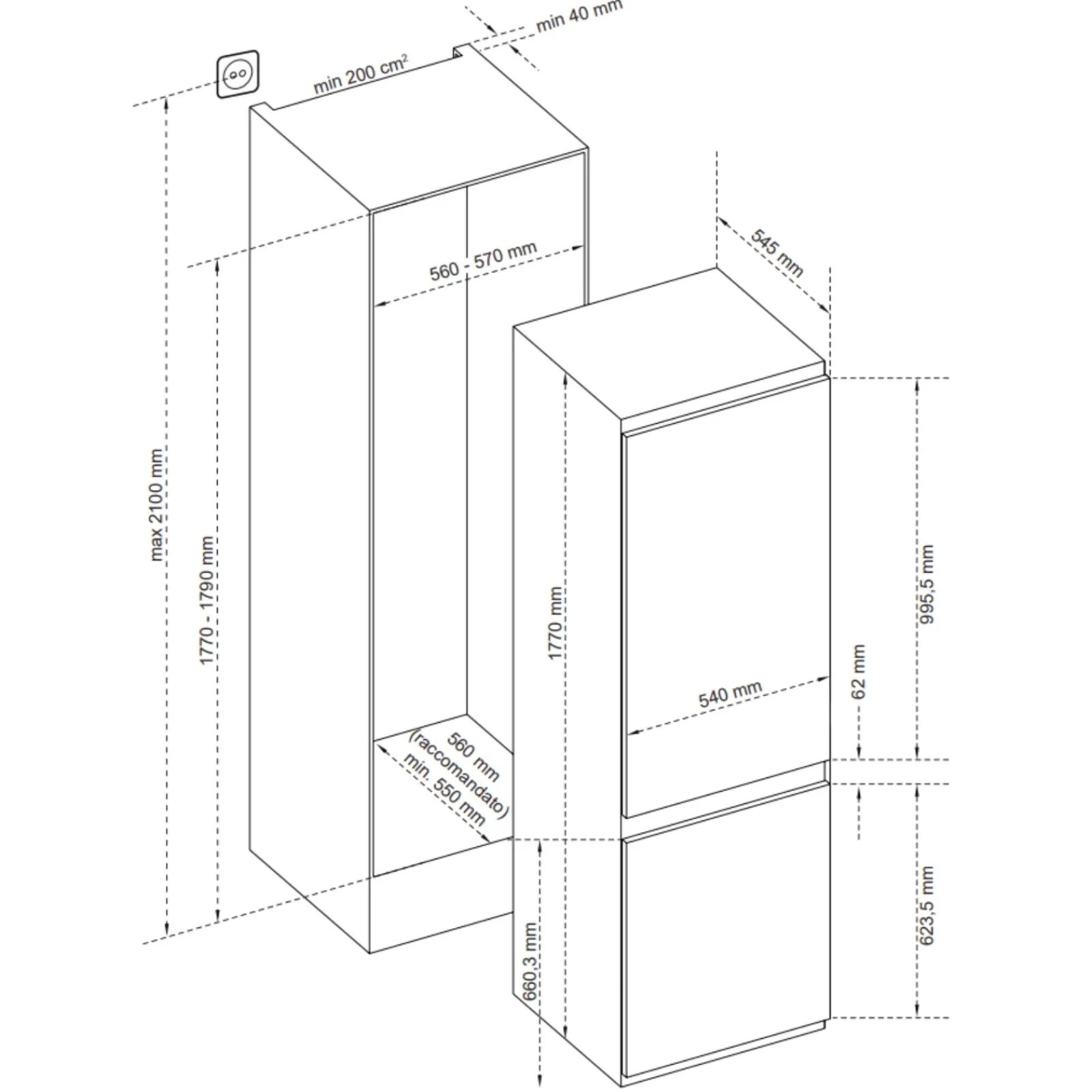 Frigorifero Atlantic da 320L a incasso con doppia porta, in colore bianco. Progettato per integrarsi perfettamente con la cucina, offre un ampio comparto frigorifero e un congelatore separato per una conservazione ottimale degli alimenti. Dotato di ripiani regolabili e cassetti per frutta e verdura, combina funzionalità e un design elegante, ideale per ambienti moderni e ben organizzati.