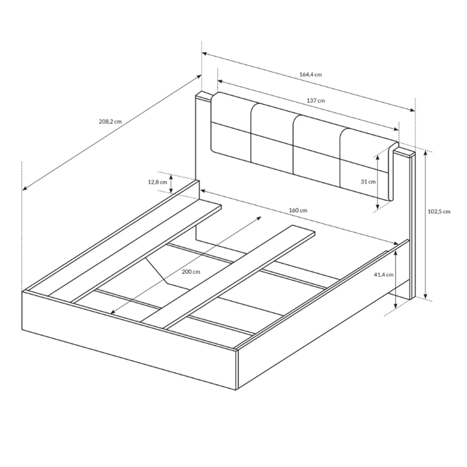 - dimensioni letto: L.164,4 x P.208,2 x H.102,5 cm