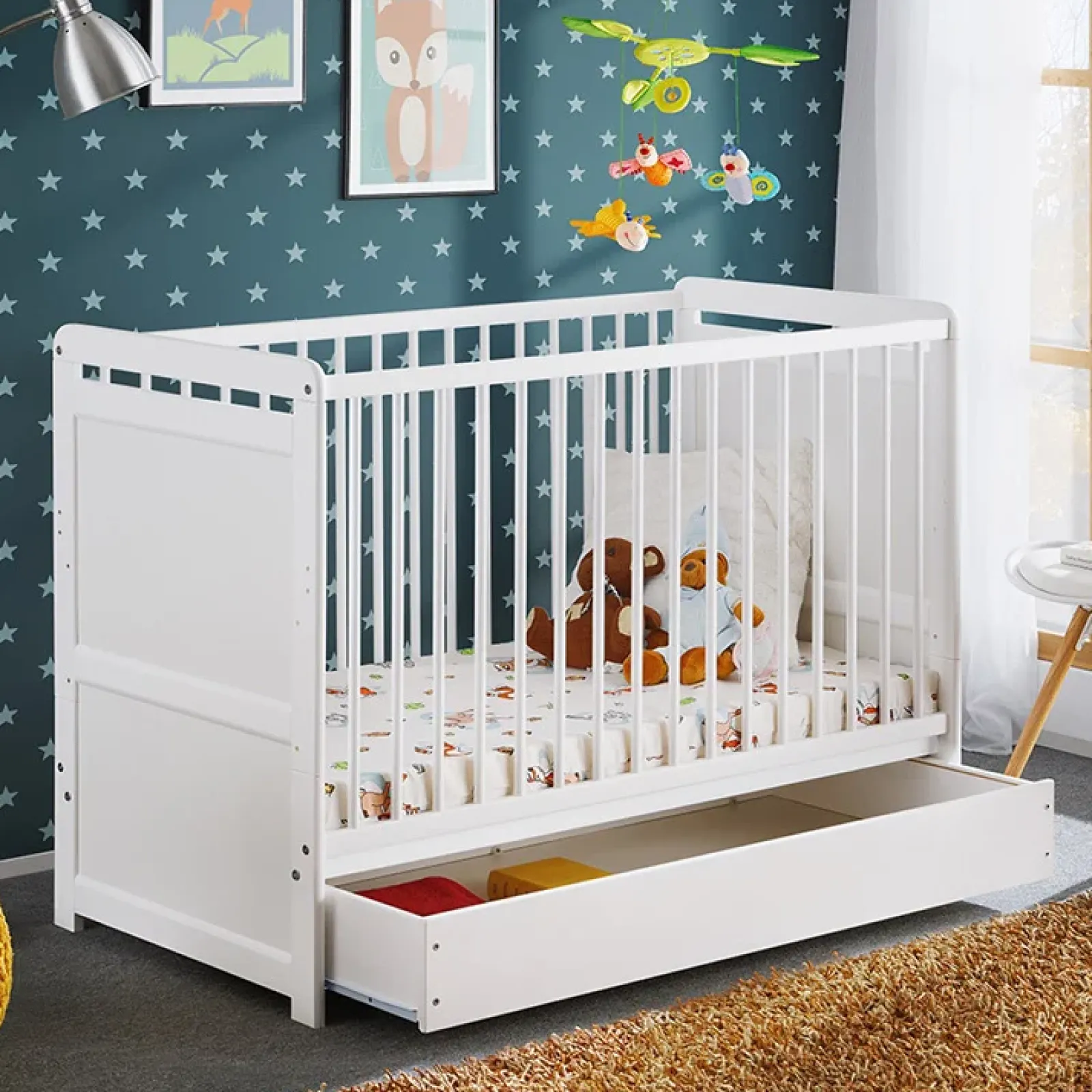 Lettino per bambini con cassetto e materasso 67x124cm bianco Magic, la soluzione perfetta per far riposare bene vostro figlio e contemporaneamente dormire sereni.