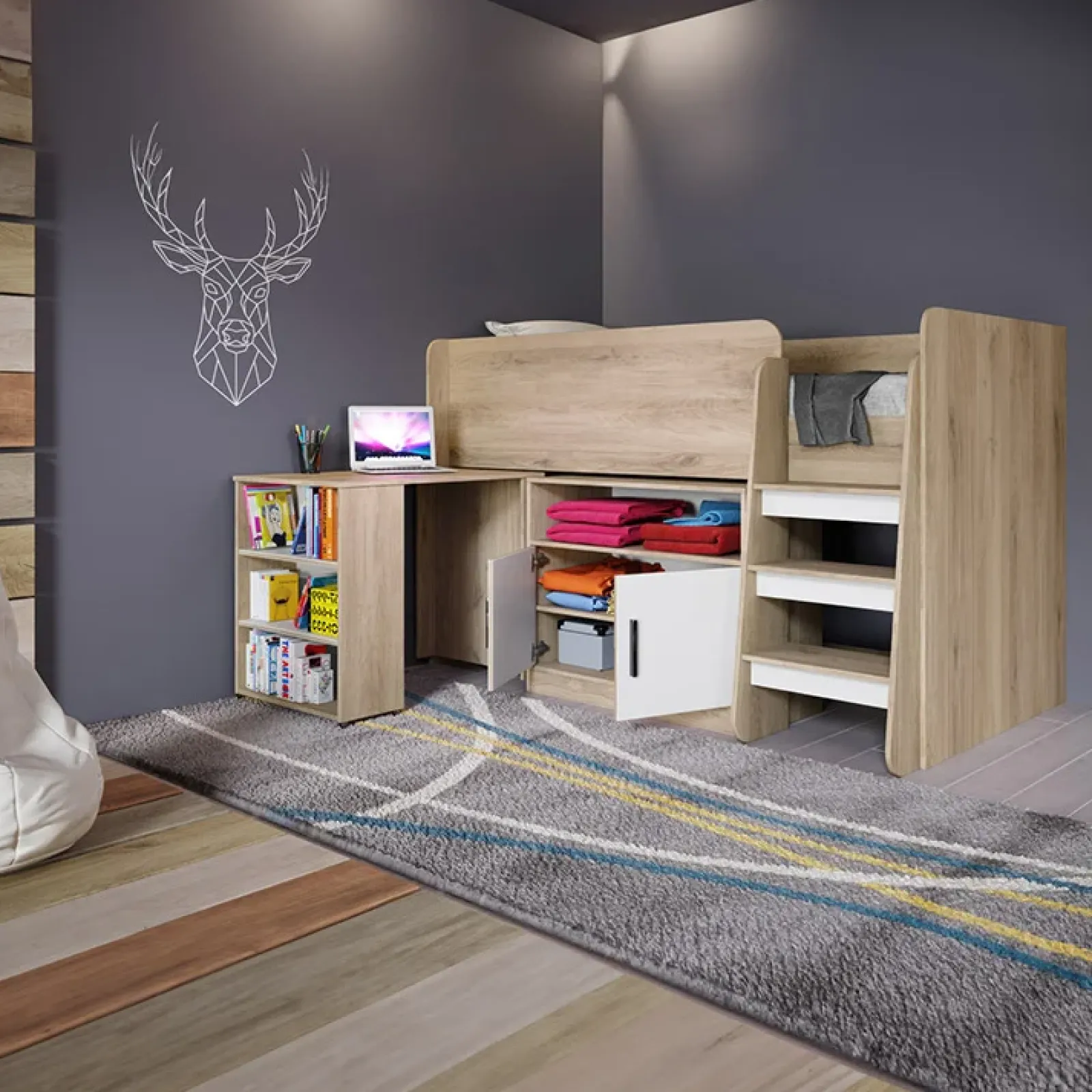 Garnero Arredamenti Letti Per Cameretta|Letti Per Bambini E Ragazzi-Letto singolo 90x200cm a soppalco rovere sonoma bianco opaco Erick