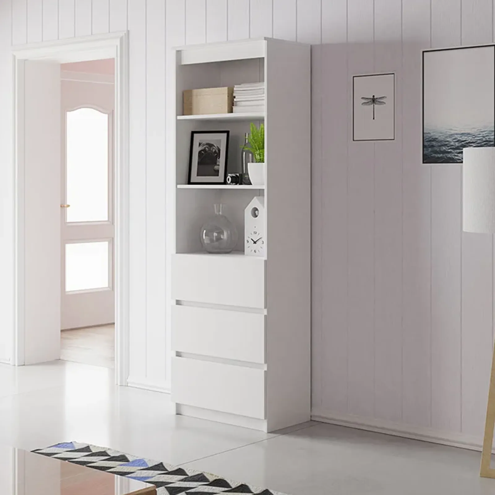 Libreria moderna 60x180cm 3 vani a giorno 3 cassetti bianco Sterling, perfetta per esporre i tuoi libri e mantenere l’ordine dei tuoi documenti.