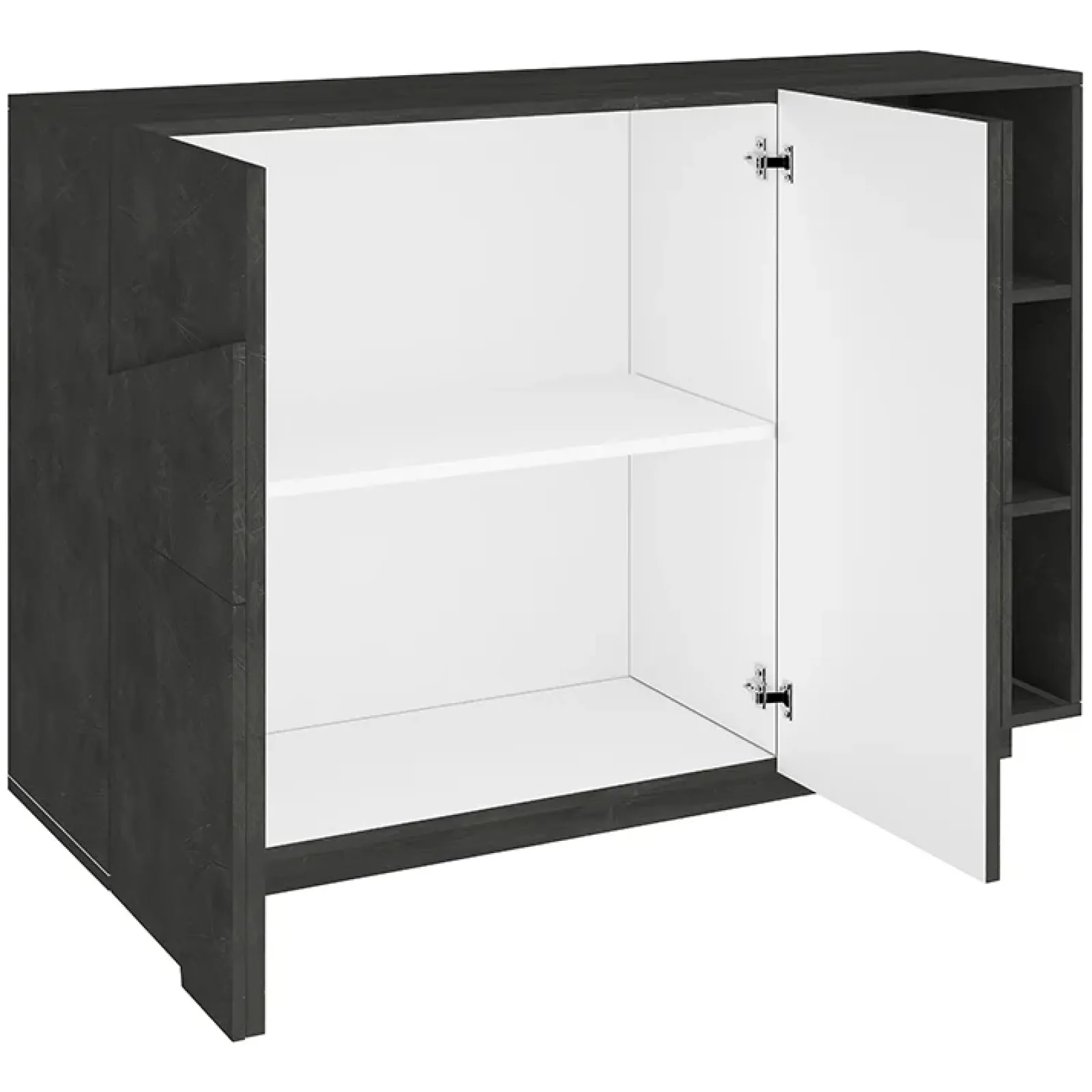 La struttura del mobile è suddivisa in due sezioni principali: un ampio vano con due ante dotate di chiusura a battente, caratterizzate da un design geometrico in rilievo che non solo aggiunge interesse visivo ma funge anche da comoda presa per l’apertura. Al centro, una mensola offre ulteriori possibilità di organizzazione e esposizione per oggetti decorativi o pratici.