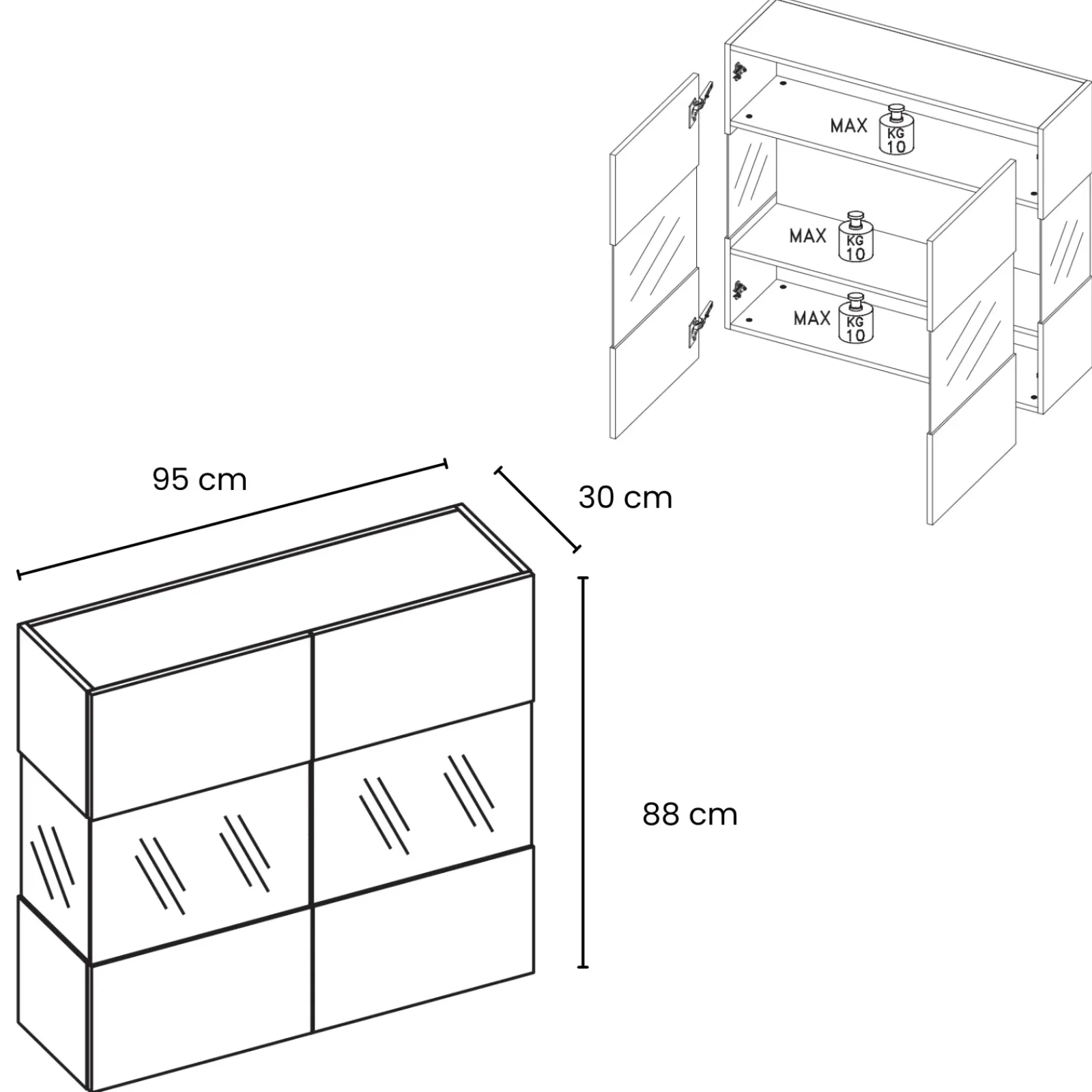 | Peso massimo supportato | 10 kg per ripiano |