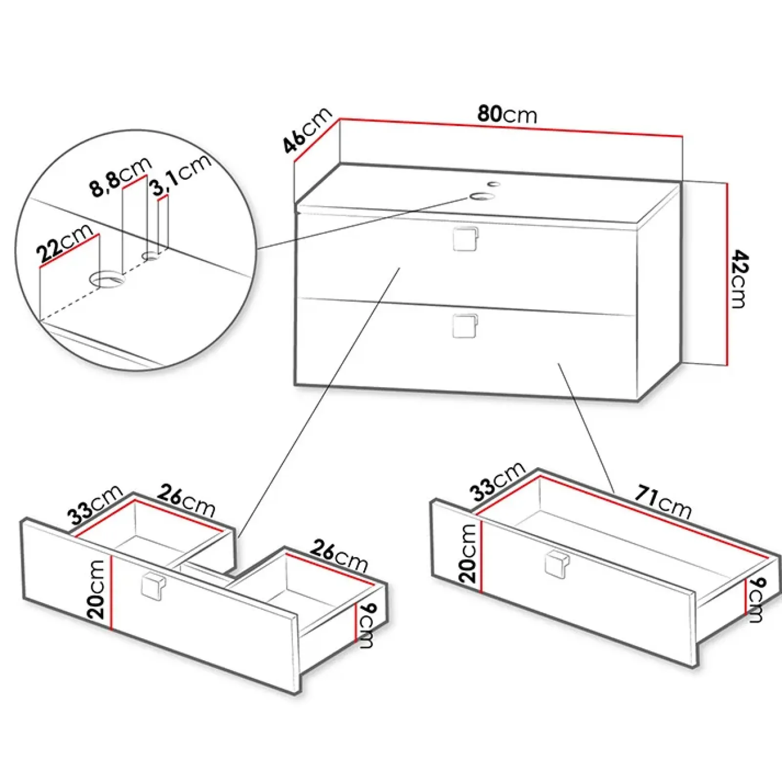 - dimensioni mobile: L80 cm X H42 cm X P46 cm