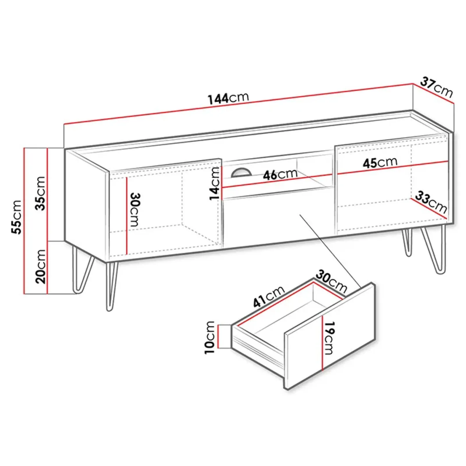 - dimensioni mobile tv: L144 cm X H55 cm X P37 cm