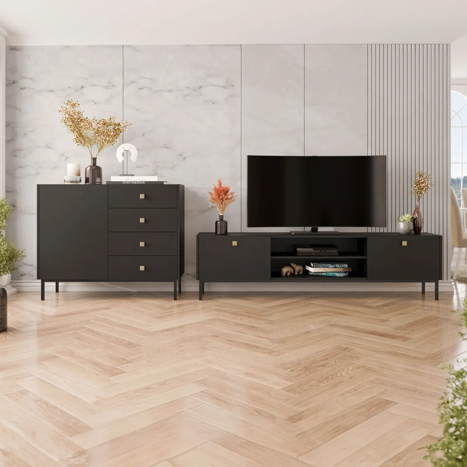 Stai cercando un mobile per il tuo soggiorno che unisca ordine e stile, dando un tocco di classe al tuo ambiente? Il Mobile porta TV Giuggiola è la soluzione perfetta! La sua finitura nero opaco arricchisce lo spazio con un’eleganza sofisticata, aggiungendo un pizzico di mistero e modernità, ideale per chi desidera un look contemporaneo e senza tempo. Dotato di due ante con maniglie in metallo dorato, il mobile si apre facilmente, rivelando due ampi vani interni perfetti per riporre oggetti più voluminosi, mantenendo così tutto in perfetto ordine. Al centro, due vani più piccoli, divisi da un elegante ripiano, sono pensati per ospitare console da gioco, DVD, decoder e controller, garantendo un accesso rapido e comodo ai tuoi dispositivi multimediali. Il mobile è dotato di un foro passacavi, progettato per gestire ordinatamente i cavi della TV e degli altri apparecchi, mantenendo un aspetto pulito e funzionale. La sua spaziosa superficie superiore offre una base solida per supportare TV di grandi dimensioni, garantendo sicurezza e stabilità. Ma non solo, è anche l’ideale per accogliere decorazioni come lampade d’atmosfera e piante, trasformando il tuo soggiorno in un ambiente che combina funzionalità e bellezza creando un ambiente invitante dove trascorrere momenti piacevoli con familiari e amici. Il mobile è inoltre dotato di piedini in metallo nero che contribuiscono a creare un look più leggero e moderno, creando un’atmosfera più accogliente e contemporanea. Con il suo design minimalista, questo mobile si integra perfettamente in qualsiasi stile d’arredo, portando un tocco di classe che dura nel tempo. Disponibile anche in altre finiture!