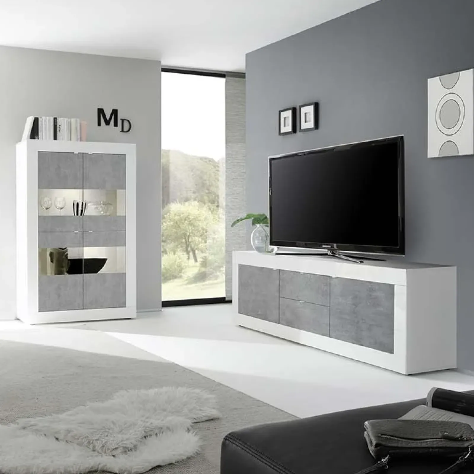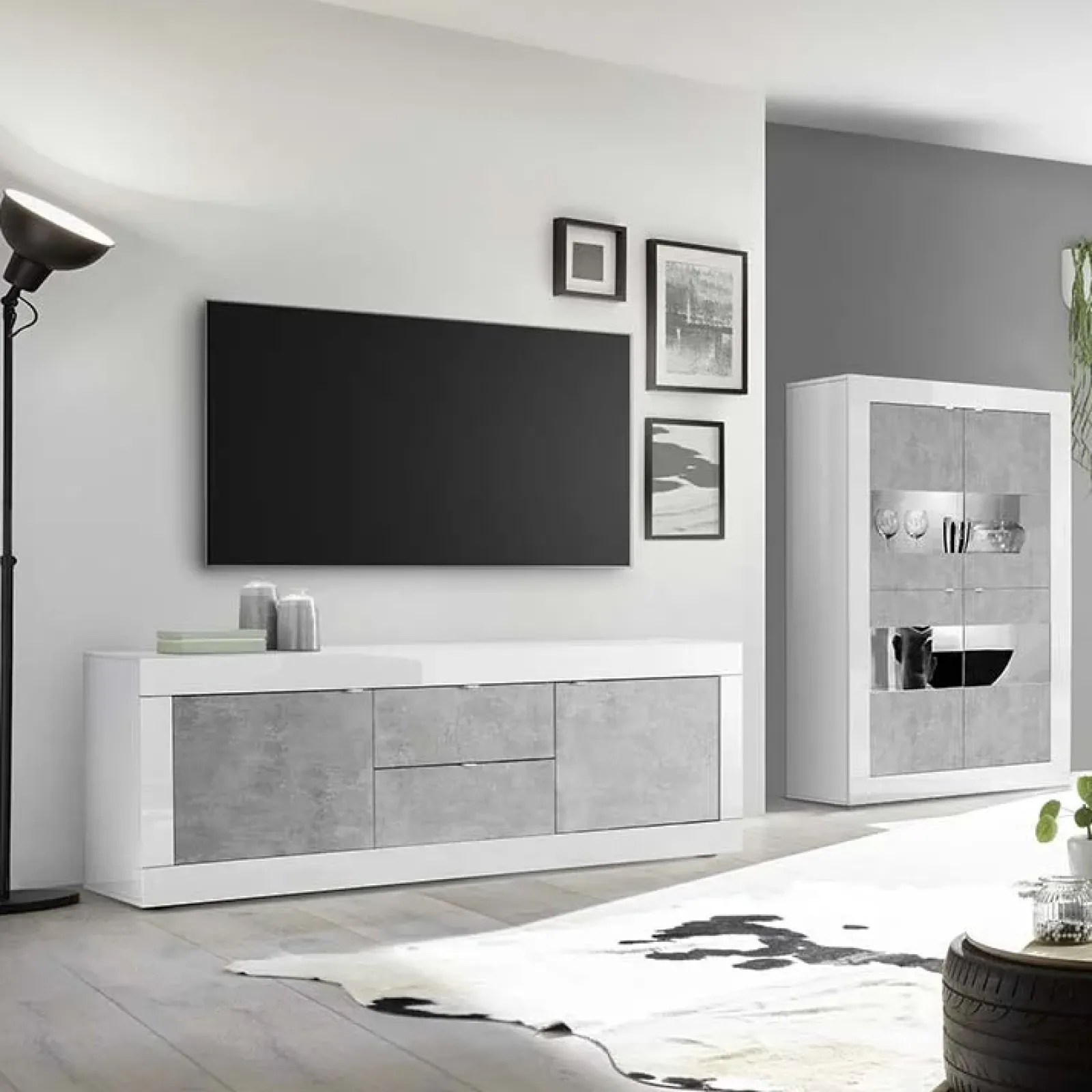 Porta tv 2 ante 2 cassetti Eternity bianco lucido cemento