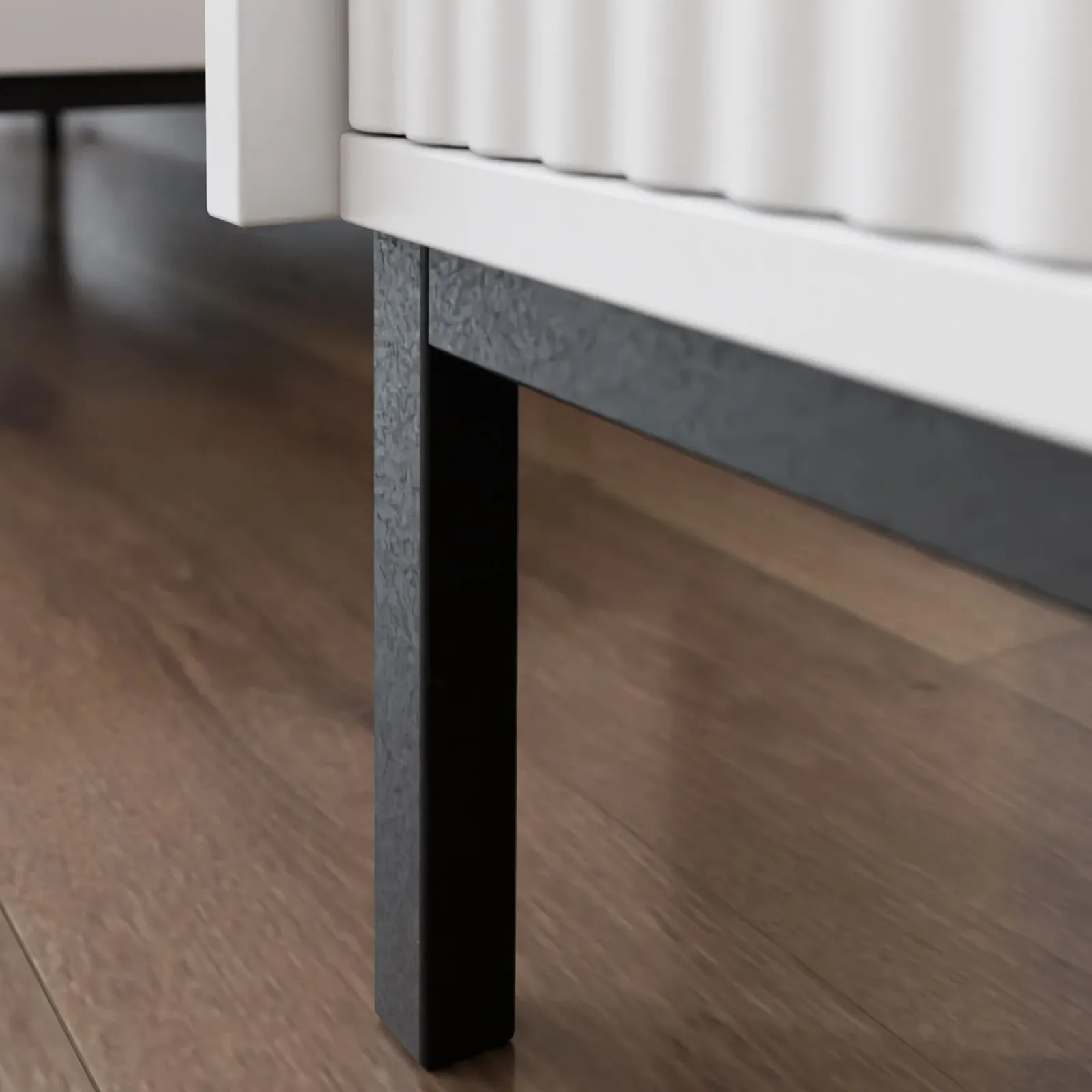 Le ante cannettate donano un tocco di originalità, creando giochi di luci e ombre che esaltano ogni dettaglio. La struttura dei piedini in metallo, solida e minimalista, conferisce leggerezza e modernità, adattandosi perfettamente a soggiorni moderni o spazi dal carattere industrial chic.