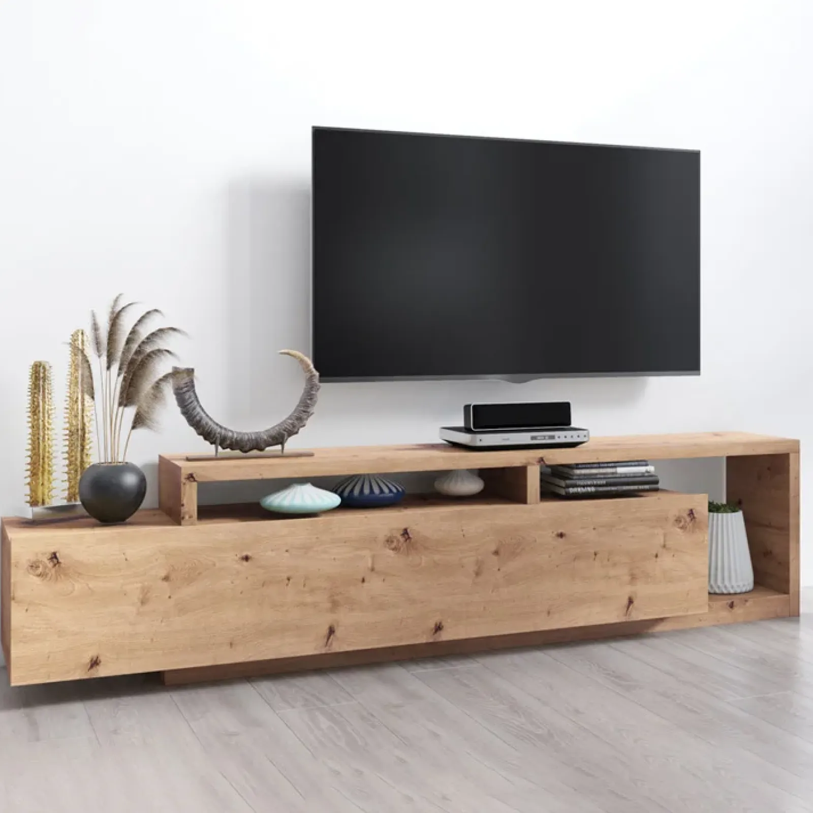 Armonioso e raffinato, il Mobile porta tv Megan risponderà ad ogni tua esigenza di funzionalità e design. La tua zona giorno catturerà immediatamente l’attenzione di tutti i tuoi amici, grazie alla sua elegante finitura rovere nodoso e alle sue forme innovative.