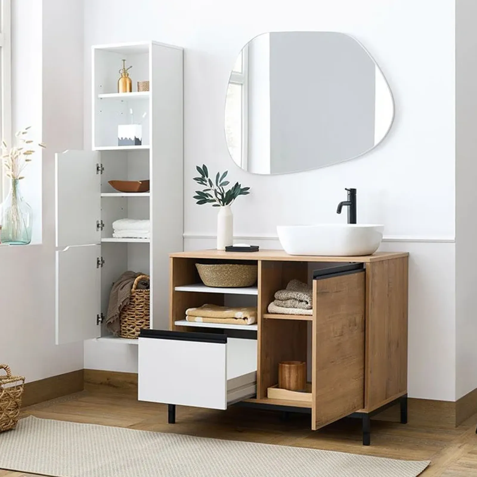 Mobile bagno 100cm con lavabo e colonna 3 ante 1 cassetto bianco rovere Jasmund: un mobile dall’aspetto originale e dal design moderno e luminoso.