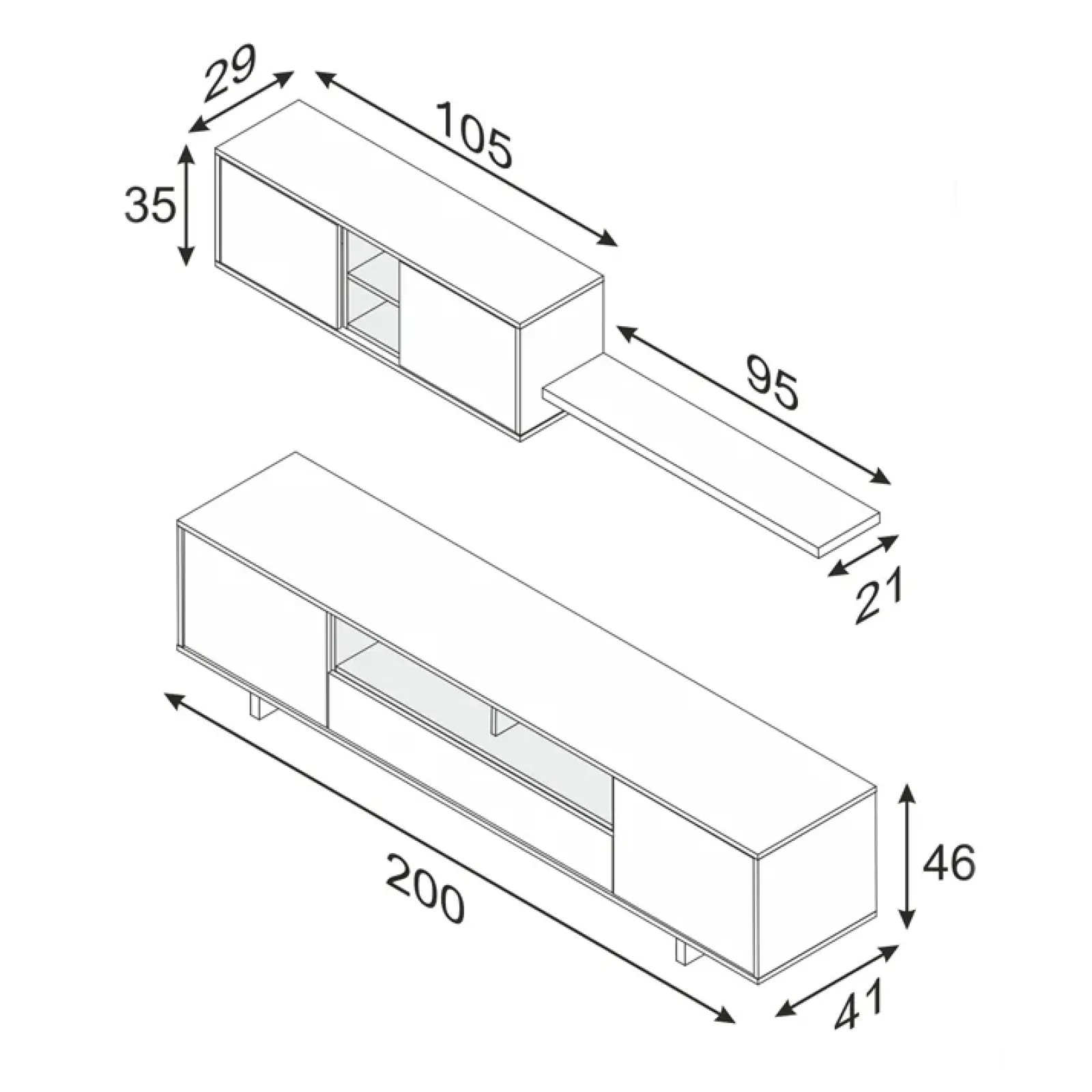 - dimensioni base tv: L.200 x H.46 x P.41 cm