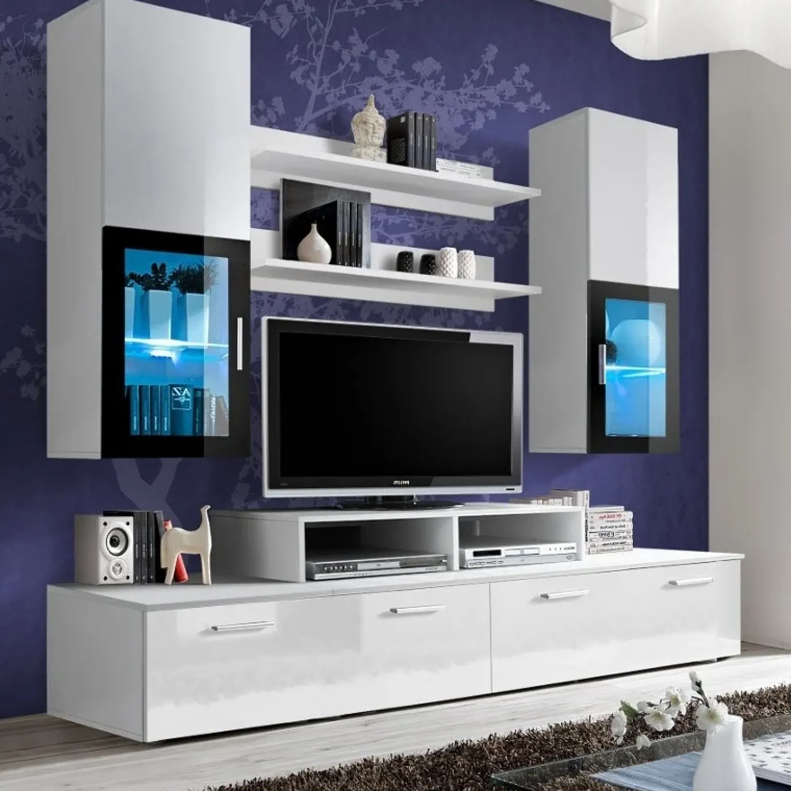 Parete attrezzata Orlando Gihome ® bianco lucido vetri neri.