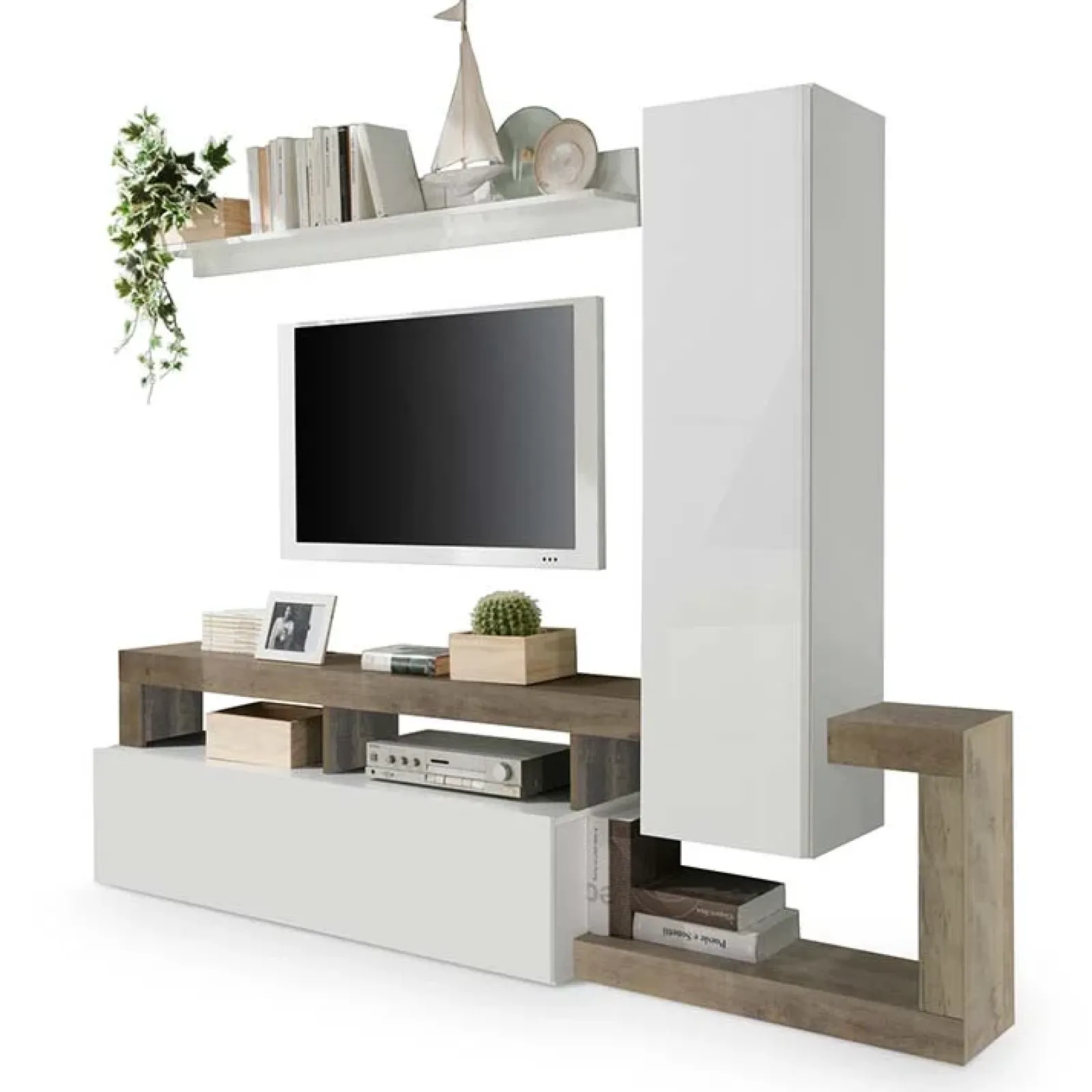 È composta da: 1 pensili verticale, con all’interno 2 ripiani, una mensola ed una base tv con anta a ribalta, tutti elementi coordinati e concepiti per offrire lo spazio di cui necessiti.