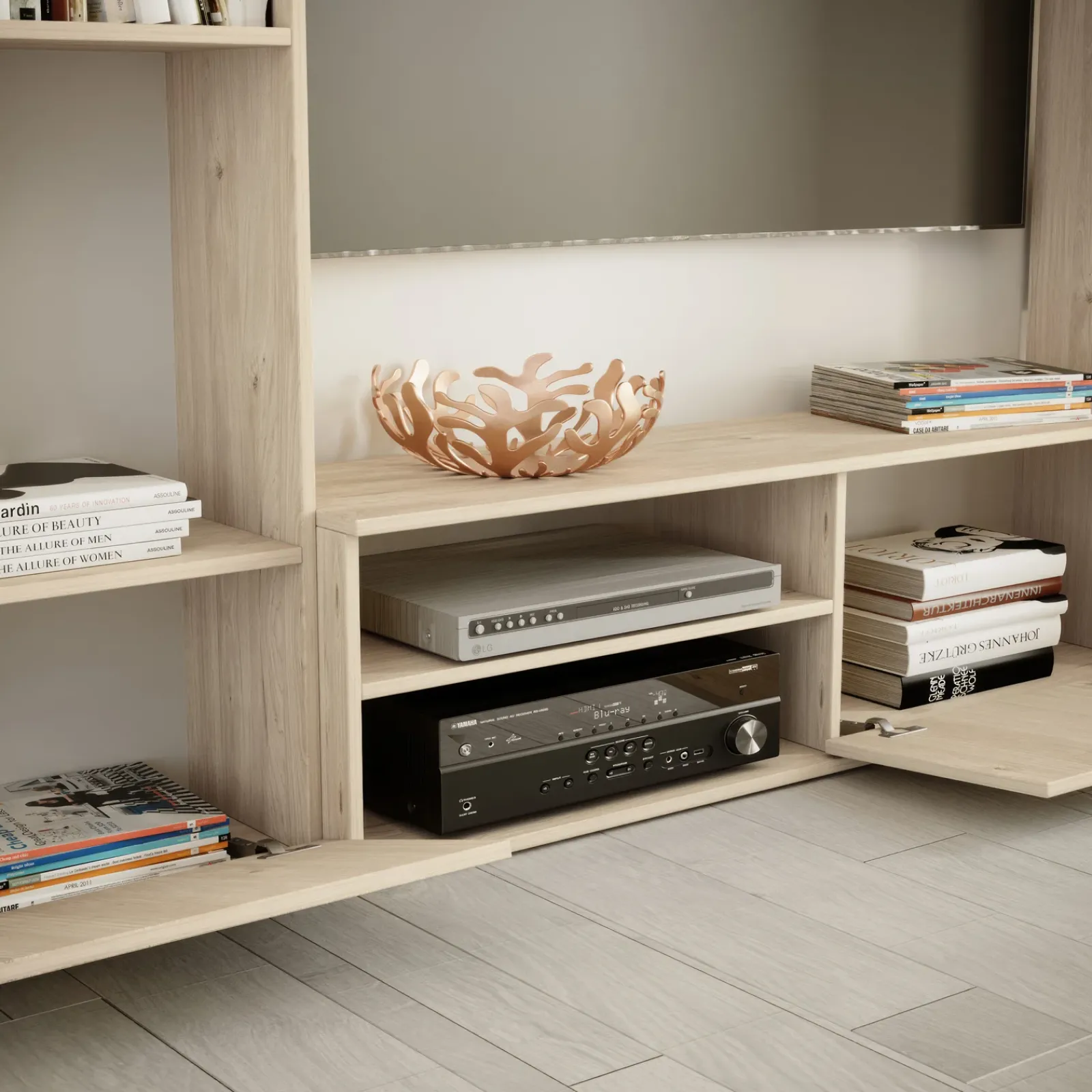 Essa è composta da un mobile porta tv, costituito da un vano a giorno con ripiano centrale e da un’anta a ribalta, da una libreria a giorno su un lato e da una colonna a giorno e anta a ribalta sull’altro.