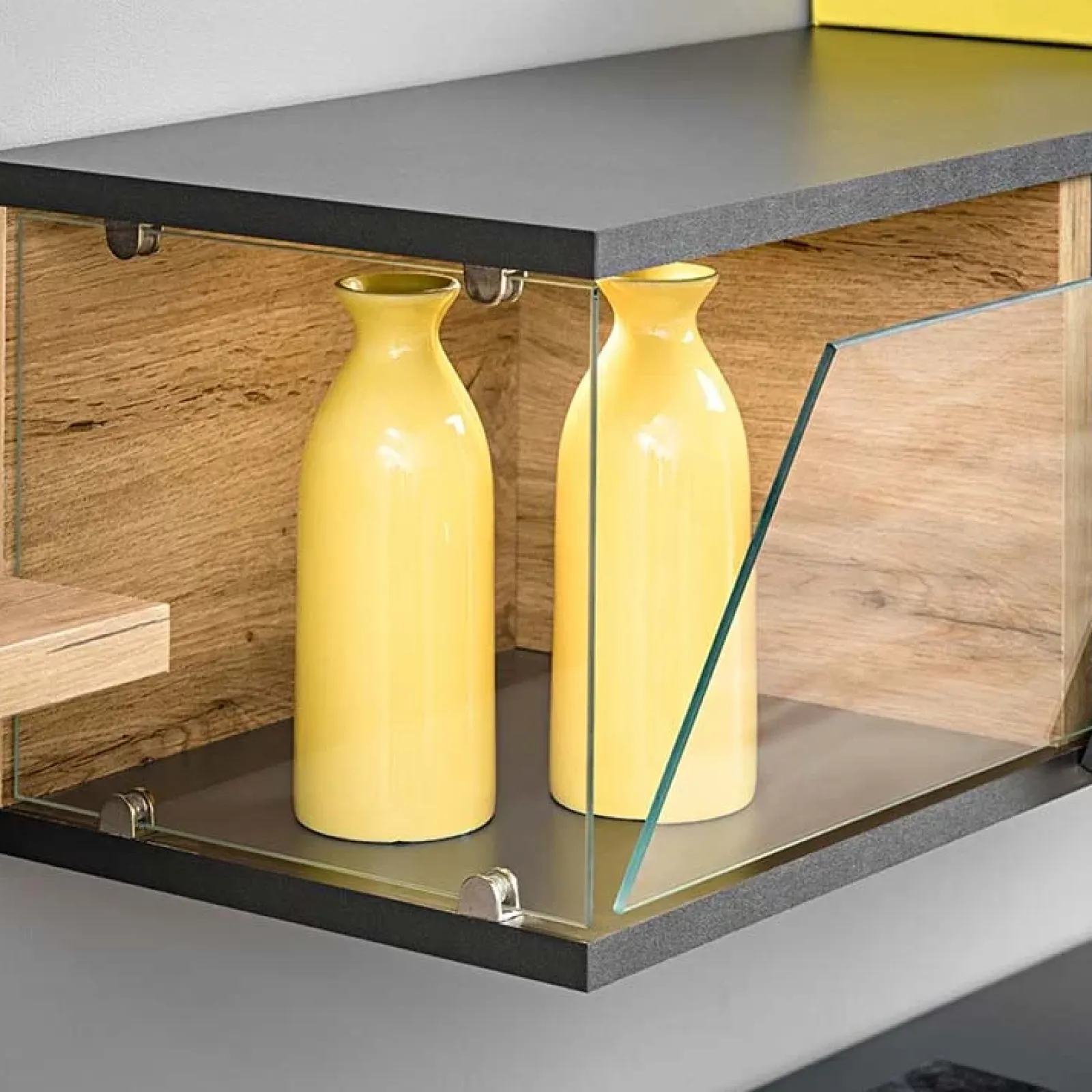 Si tratta infatti di una composizione bicolore, realizzata in tonalità eleganti e piene di personalità, quali il rovere e l’antracite opaco. É caratterizzata da forme logiche e rigorose, che risalteranno nel vostro soggiorno e lo renderanno unico. Oviedo Gihome® è composta da una base tv dotata di un’anta a ribalta con tre vani interni, una base con due vani a giorno, tre vetrine sospese con anta a ribalta e inserto in vetro sul lato sinistro e infine una mensola. Il sistema di apertura delle ante è a push-pull, estremamente comodo per rende facile e veloce l’apertura. É inoltre dotata di un sistema di illuminazione a luci LED bianche per le tre vetrine, per risaltare gli oggetti esposti e rendere l’atmosfera ancora più accogliente. Oviedo Gihome® è una parete attrezzata completa e di design, capace di adattarsi a diversi stili di arredamento, fornendoti tanto spazio utile per tenere tutto in ordine.