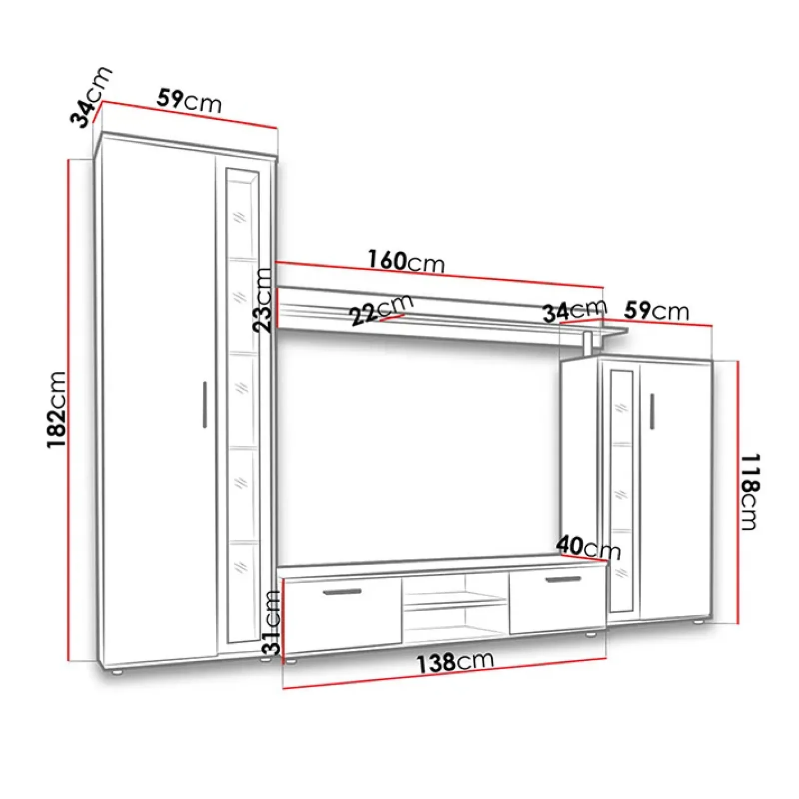 - dimensioni vetrina alta: L.59 x H.182 x P.34 cm