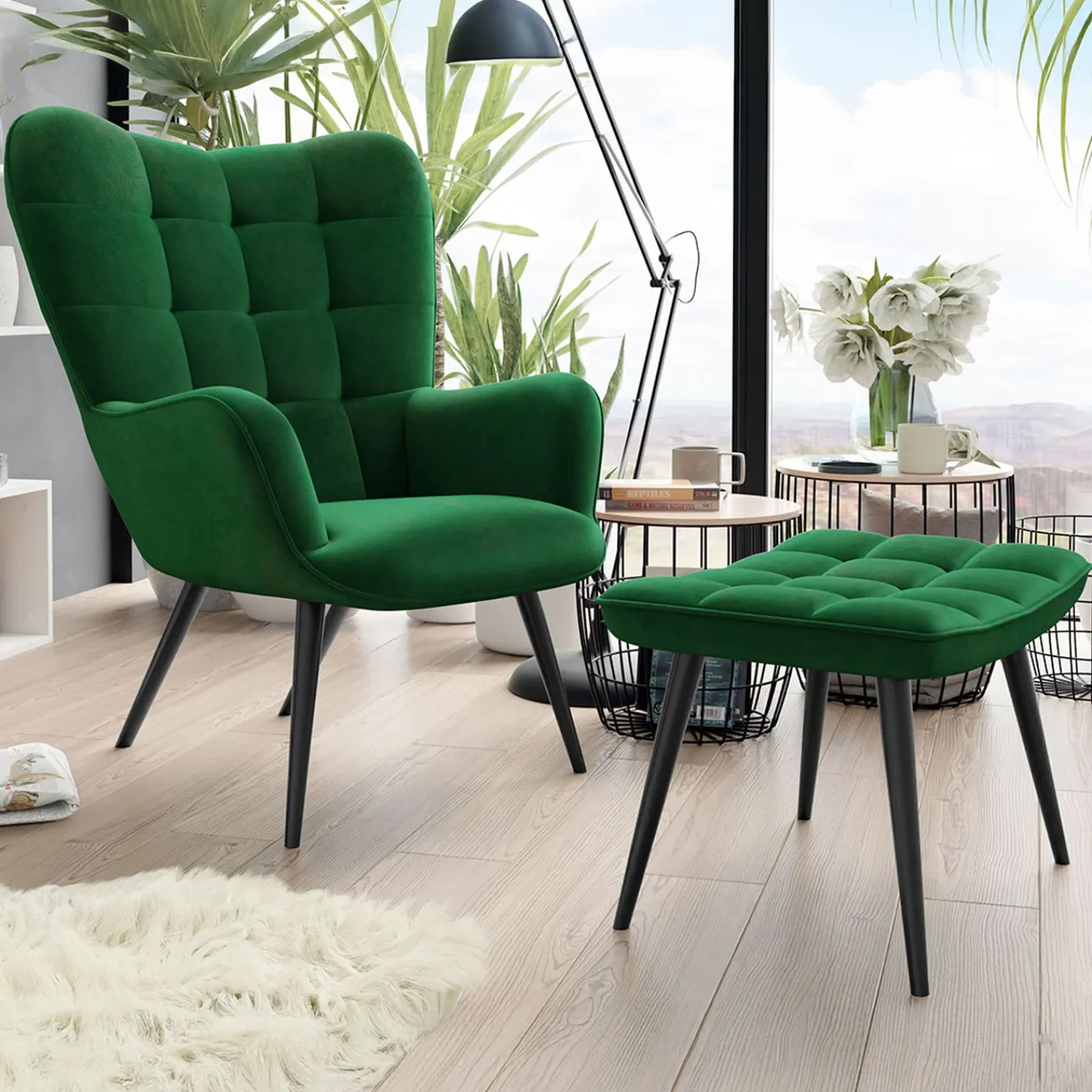 Poltrona imbottita con poggiapiedi in velluto verde Siena