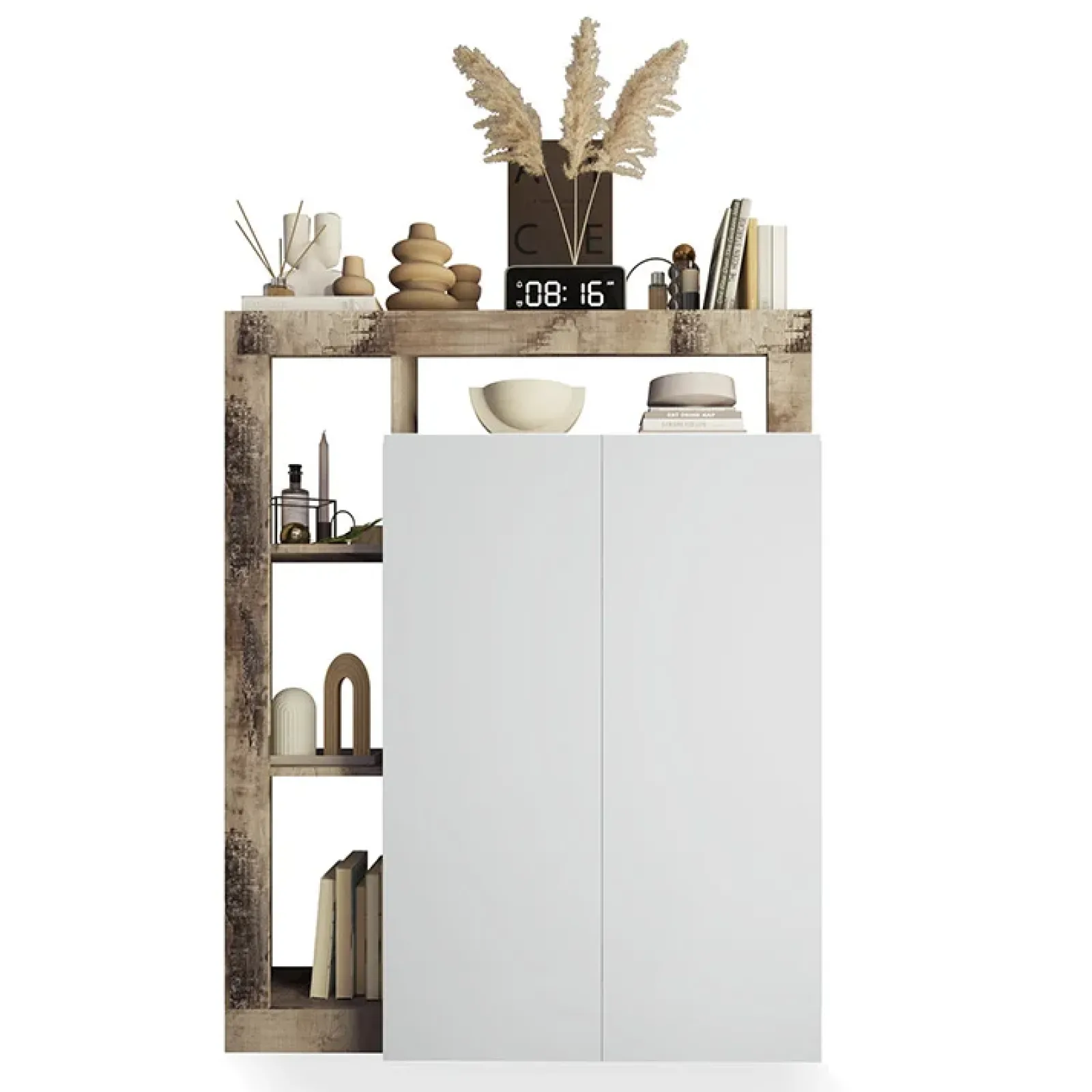 Questa scarpiera presenta ben 5 ripiani nascosti da due ante battenti e 4 vani a giorno da poter decorare ed abbellire come più ti piace.