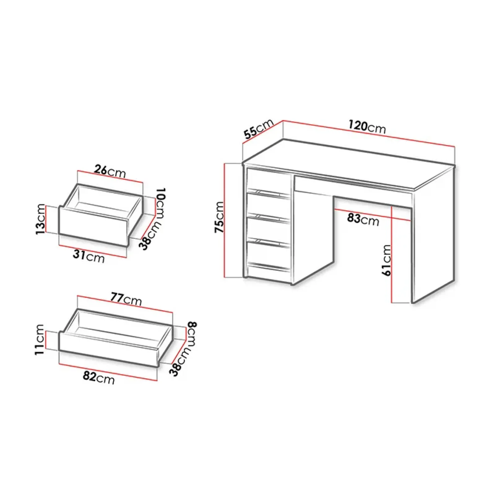 - scrivania reversibile: i cassetti possono essere montati sul lato sinistro o destro