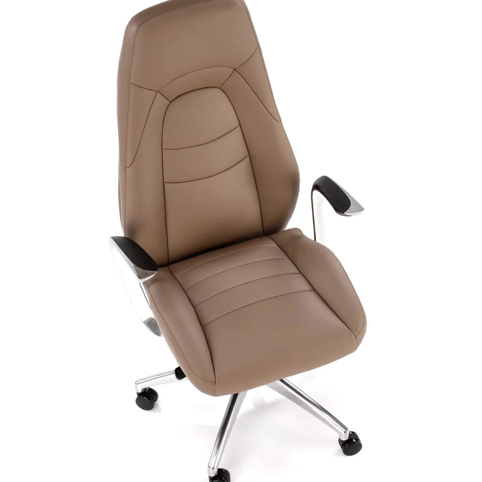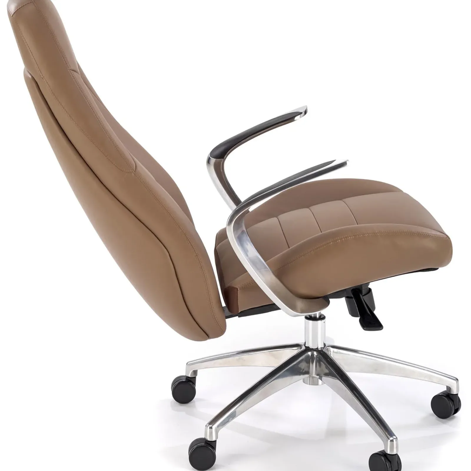Il rivestimento in ecopelle morbida e piacevole al tatto valorizza la seduta con calde sfumature cappuccino, perfette per ambienti professionali ma anche per l’home office. La struttura in alluminio dona leggerezza visiva e robustezza, mentre i braccioli integrati, anch’essi in alluminio, offrono un supporto stabile e armonioso nel design.