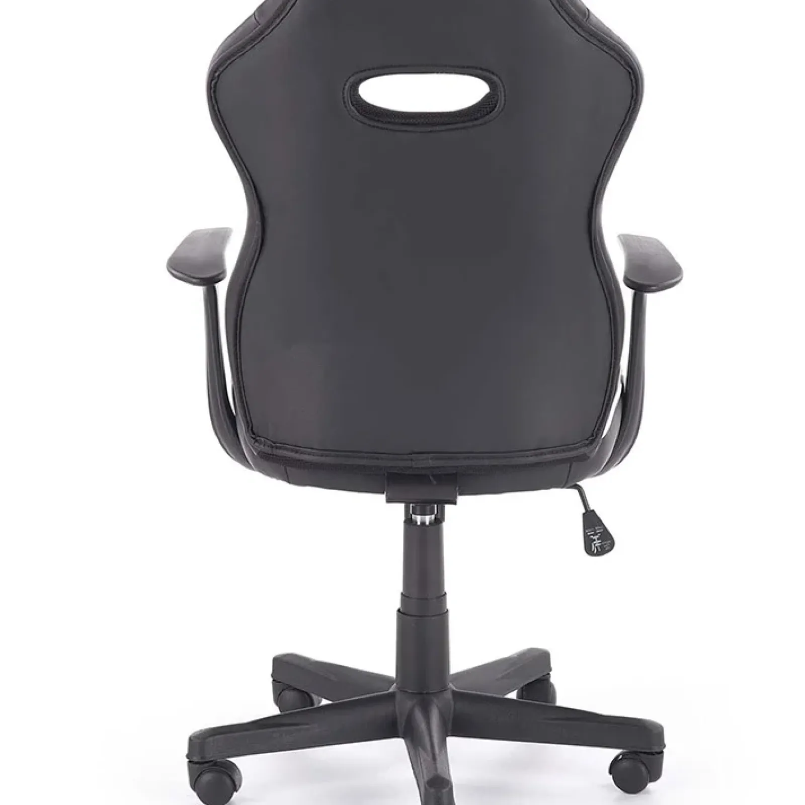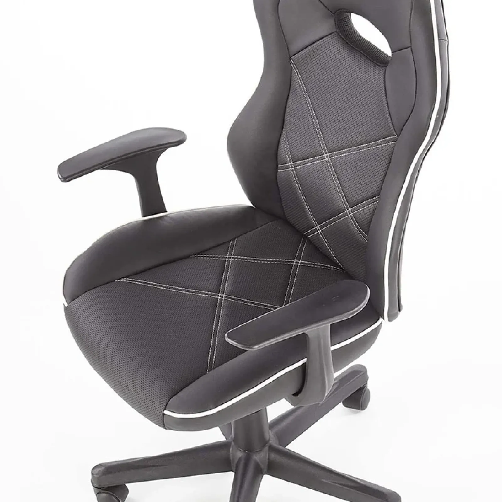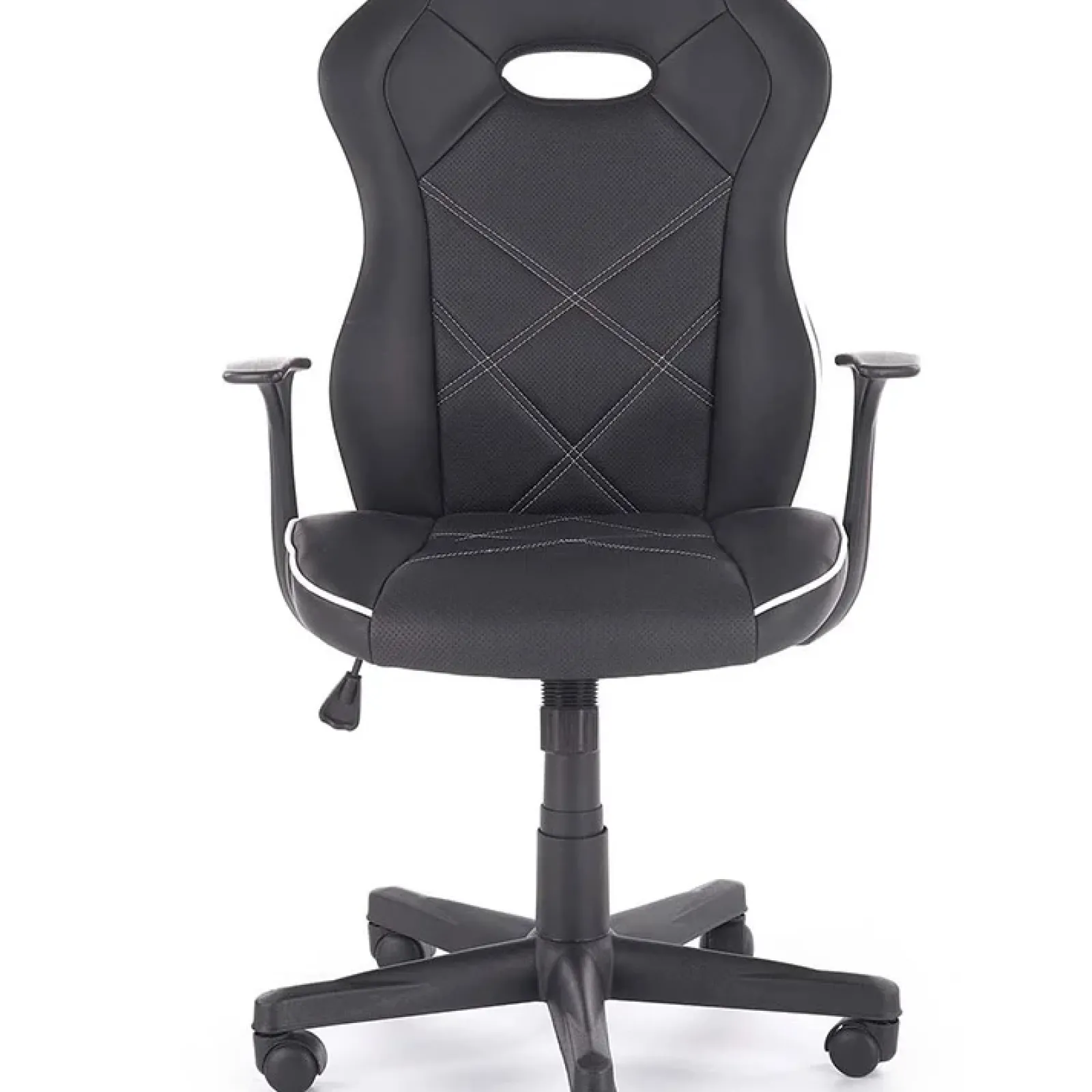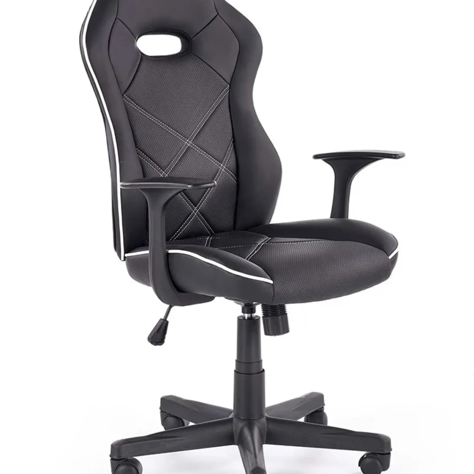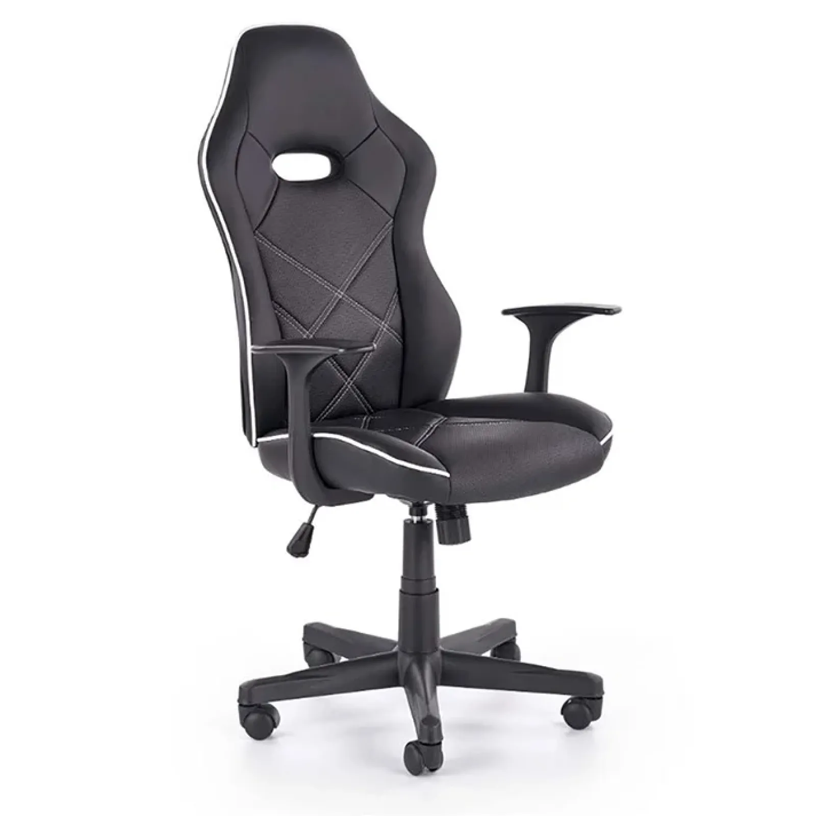 Sedia da ufficio con seduta in ecopelle nera e bianca. La sedia è regolabile in altezza, per cui è perfettamente adattabile alla scrivania, garantendo il giusto comfort.