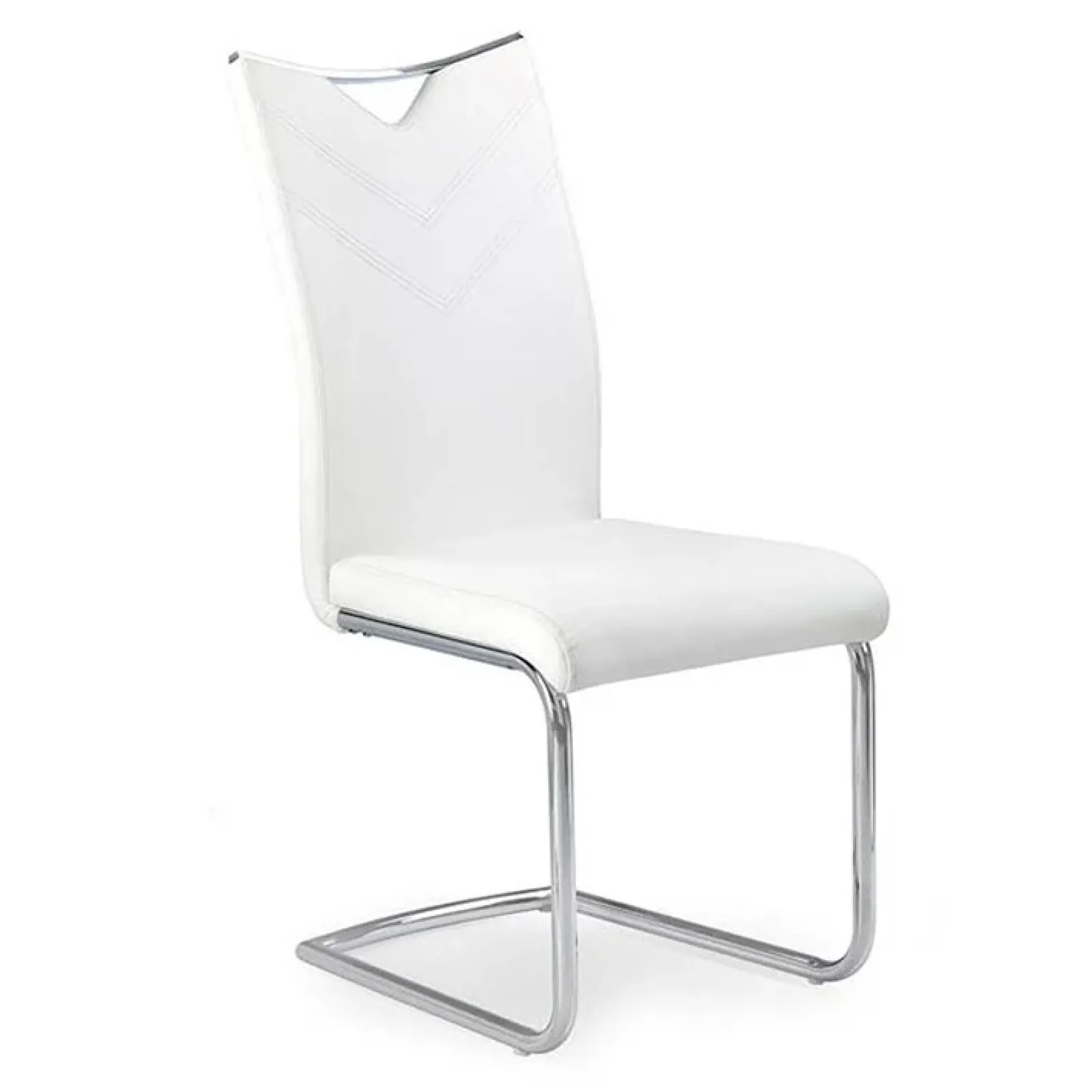 Il sedile e lo schienale in ecopelle bianca offrono una soluzione pratica e facile da pulire, senza rinunciare all’estetica. La struttura in acciaio cromato aggiunge un tocco di modernità e solidità.