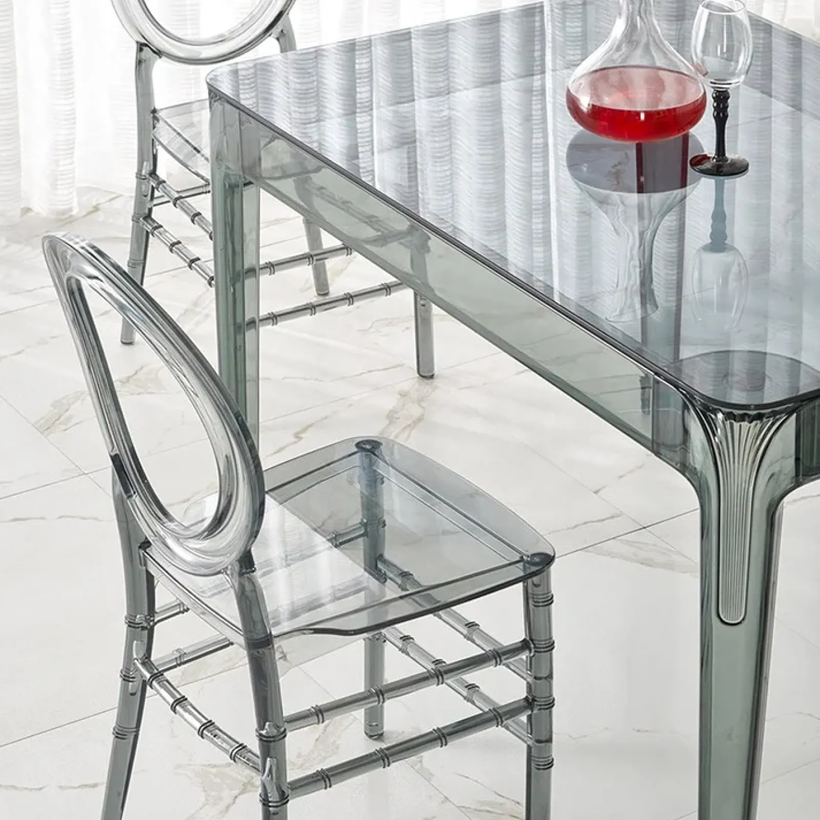 Se stai cercando un tavolo moderno ed elegante che si distingua nei tuoi interni, il tavolo Naked trasparente, realizzato in vetro fumè e polipropilene, è un’ottima scelta.