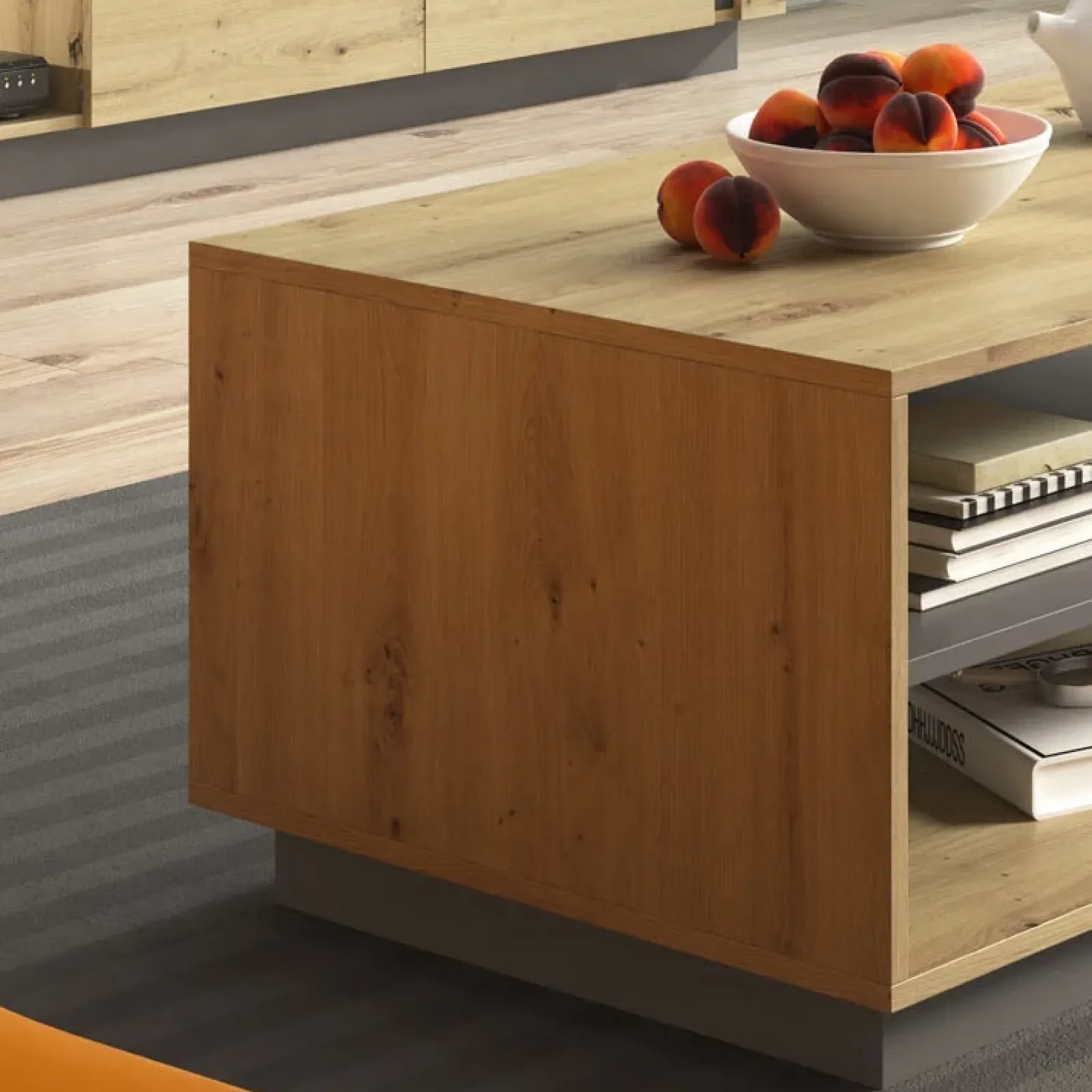 Esso presenta una struttura a giorno in rovere con ripiano centrale in finitura grafite, e poggia su una base anch’essa grafite.