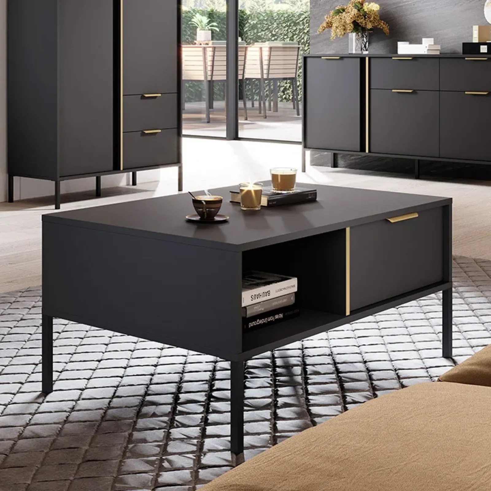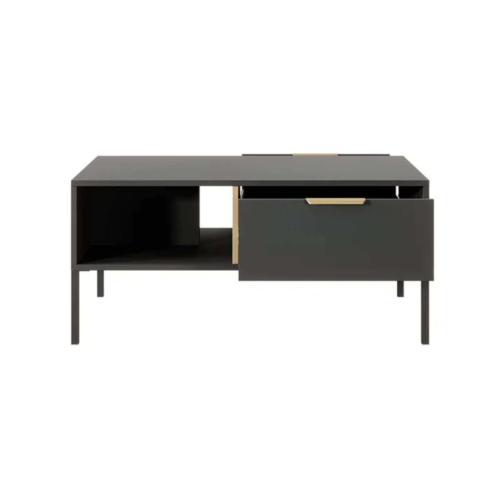 Dotato di 1 cassetto e 1 vano a vista, potrai godere di molto spazio per dispositivi e console. L’apertura del cassetto è con comode maniglie esterne. Capienza e funzionalità non possono mancare in un elemento d’arredo così unico! Sorprende per la sua finitura in antracite che risalta grazie ai bordi in effetto oro. La soluzione è davvero innovativa, originale ed elegante. La struttura rialzata, grazie a comodi piedini in metallo nero, mette in evidenza le forme armoniose di questo complemento.