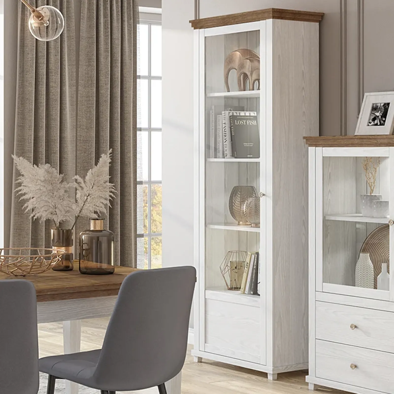 La vetrina Texel sinistra 1 anta bianco frassinato rovere è un complemento d’arredo dallo stile romantico, che incarna tutto il sapore, il calore e soprattutto il fascino delle cose che hanno una storia da raccontare.